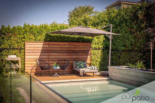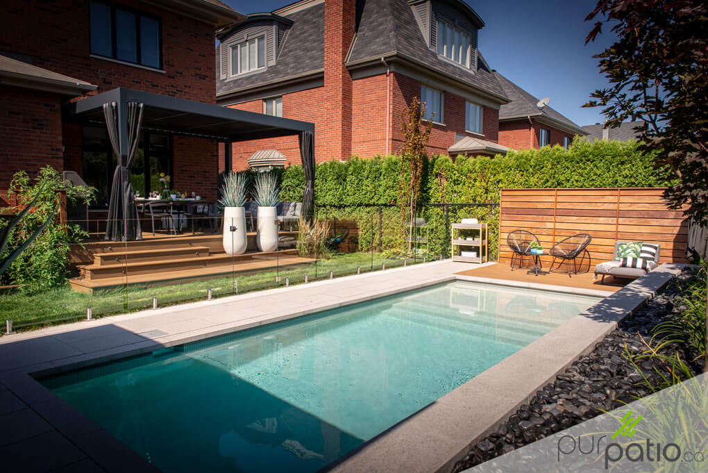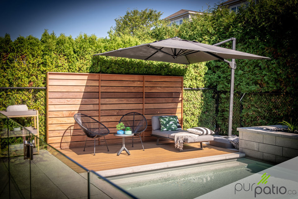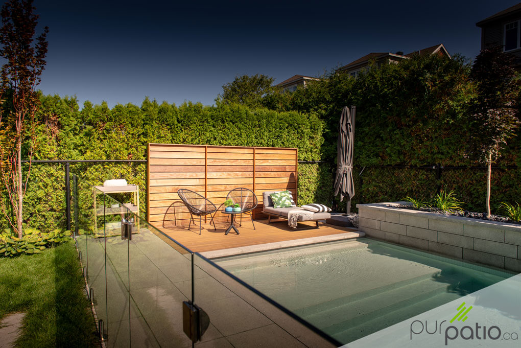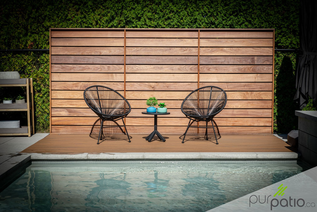 Ce patio de piscine au look moderne est un coin parfaitement relaxant pour se détendre et profiter pleinement du soleil. Il est en composite Trex, de couleur Havana Gold, qui offre une surface durable et sans entretien tout en ressemblant énormément au véritable bois. La section est agrémentée d'un mur d'intimité en ipé horizontal qui s'agence à merveille avec la couleur du patio. Cet aménagement simple s'avère être une vraie oasis de paix durant les belles journées d'été.