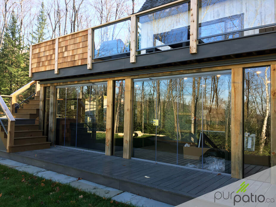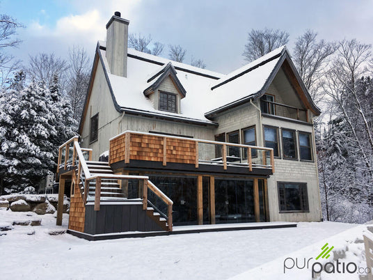 Notre client souhaitait avoir un pavillon extérieur ainsi qu'un grand patio pour profiter de sa cour au soleil, mais aussi à l'abri des intempéries. Ce projet d'aménagement complet, situé dans les Laurentides, comprend un patio en composite au premier niveau. Cette grande surface est idéale pour cuisiner et manger des repas à l'extérieur, pour se faire bronzer et se détendre au soleil. Il a comme grande qualité de ne nécessiter aucun entretien. Étant donné que le terrain est en pente, nous avons eu l'espace suffisant pour aménager la véranda sous le patio. Elle est fermée par des moustiquaires ainsi que par des vitres, ce qui en fait quasiment une pièce supplémentaire à la maison. Elle sert à recevoir le spa ainsi que deux bars et un espace lounge. Nous avons réutilisé l'espace perdu sous les marches de l'escalier pour construire une petite cabane pour les enfants. Cet aménagement complet a vraiment de quoi faire le bonheur de tous ces occupants!