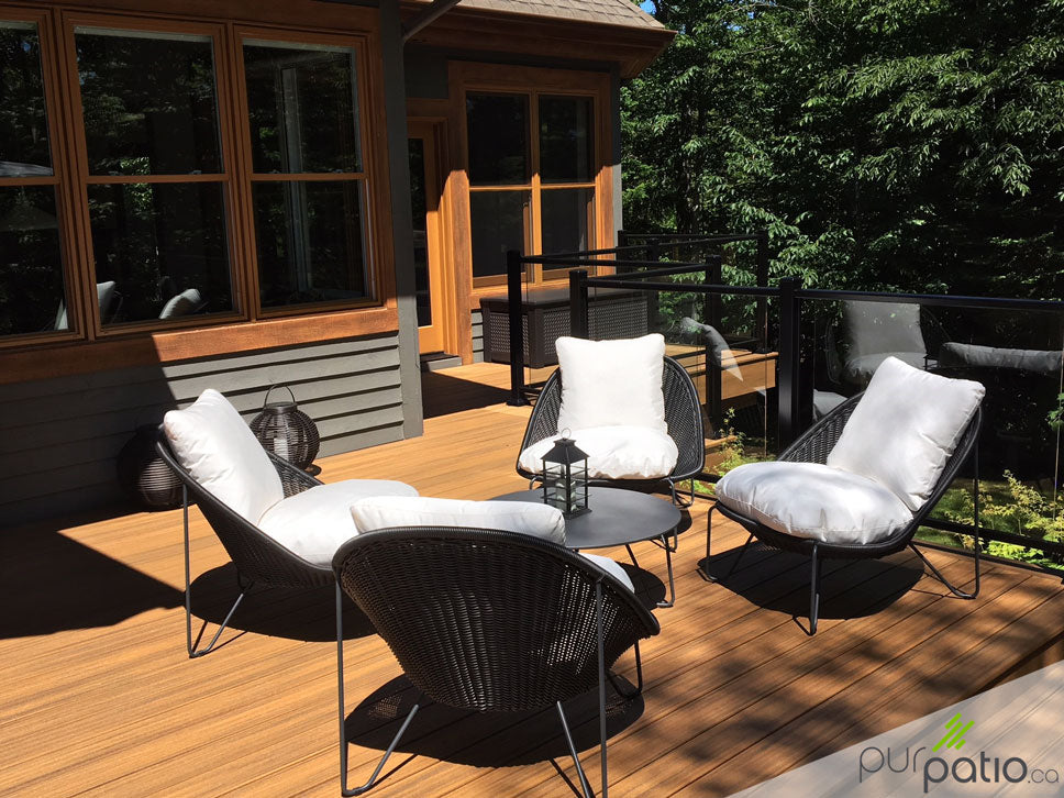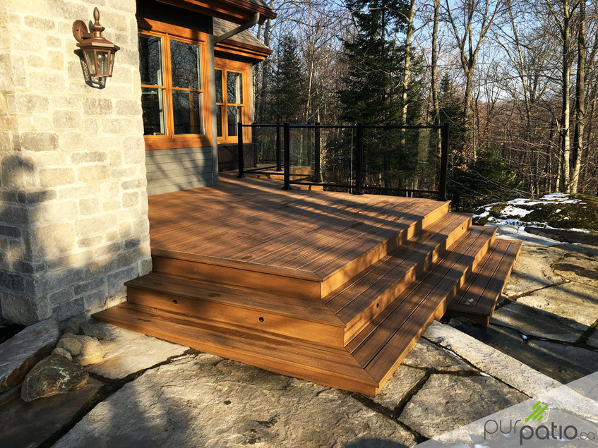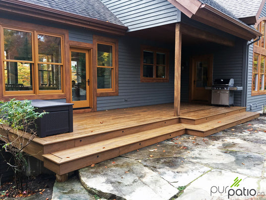 Nous avons effectué la rénovation de ce patio en composite Trex Transcend Tropical de couleur Havana Gold. L'ancien patio était désuet, mais avait une bonne fondation sur pieux vissés que nous avons conservée. Quand nous le pouvons, nous priorisons la rénovation du patio avant la construction d'un nouveau, mais la fondation et la structure doit être solide et utilisable pour un nouveau patio. Nous avons donc choisi de conserver la même disposition et de construire un patio solide et durable avec une garantie de 25 ans sur le composite Trex.