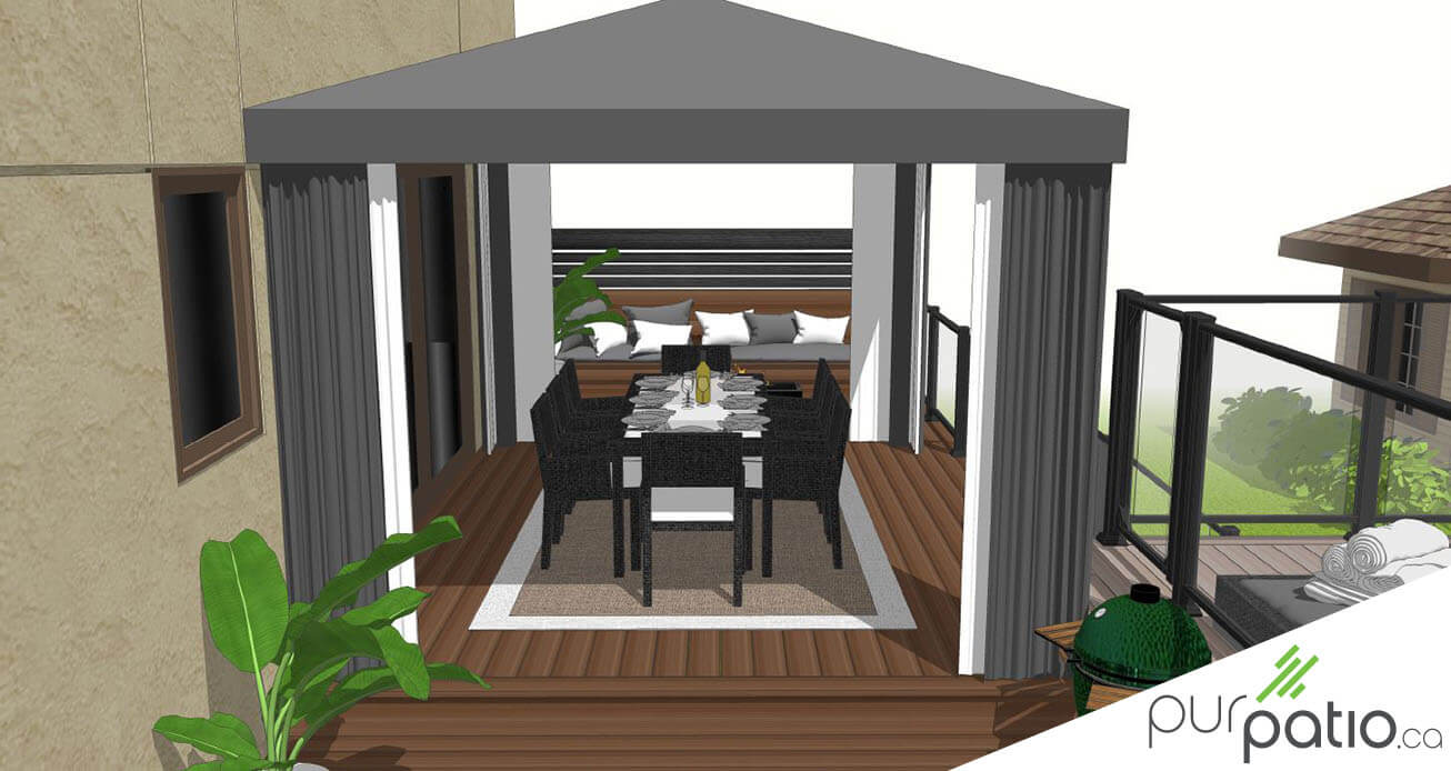 Un patio élégant en composite, doté d’une structure couverte moderne et d’un espace repas accueillant, parfait pour profiter du plein air en confort et en intimité