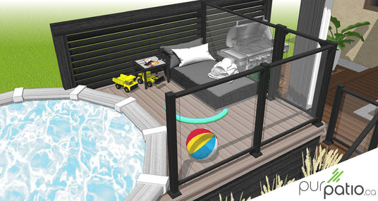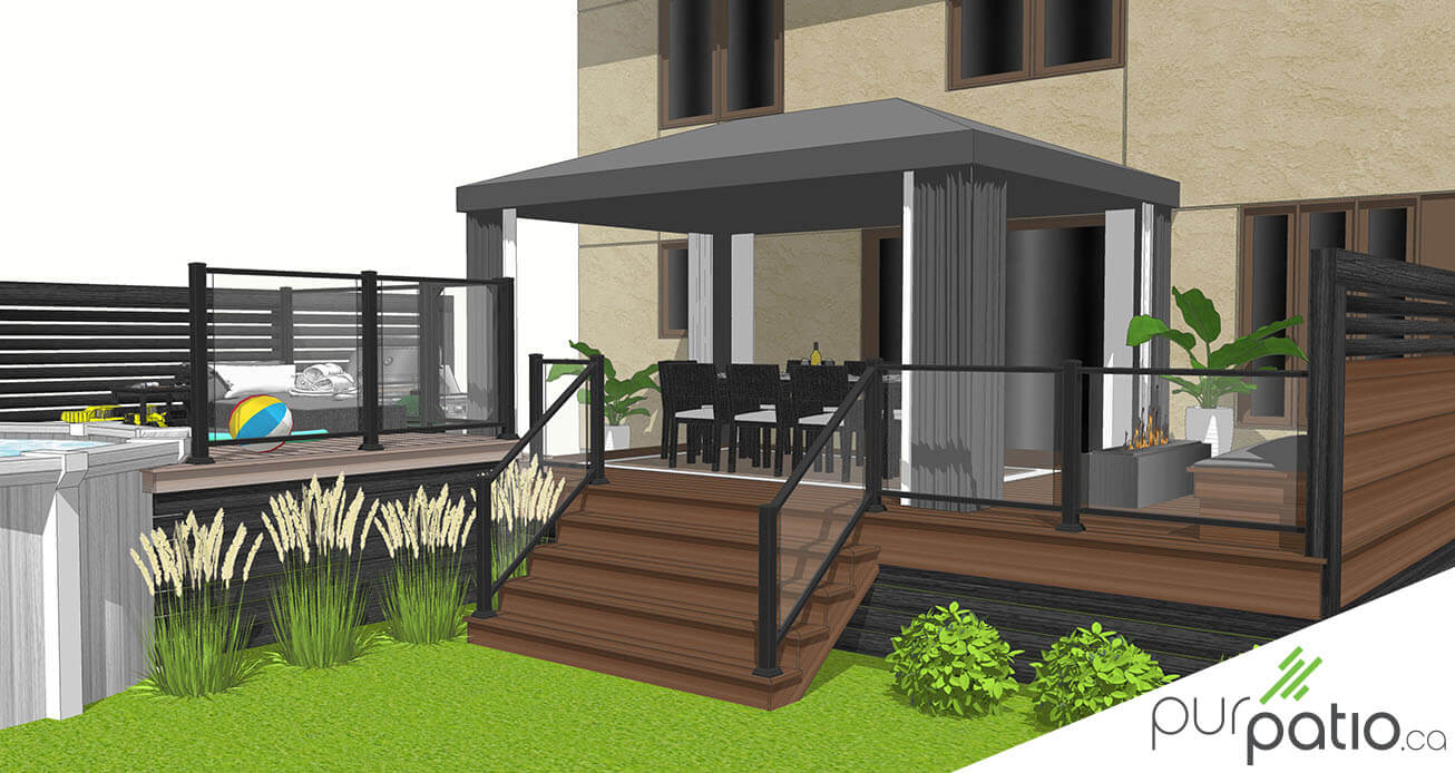 Nous avons construit un premier palier pour loger la zone repas et la zone lounge. Nous l'avons faite en composite Trex de couleur Treehouse de la gamme Transcend Classic. Étant donné le format important du gazebo et de sa forme rectangulaire, nous l’avons aligné avec la porte-patio. De cette façon, les colonnes arrivent de chaque coté ce qui dégage la vue vers la cours et la piscine. Nous y avons aménagé la zone repas avec une table pouvant recevoir 8 personnes. De plus, sur le même palier, nous avons créé une banquette en composite sur mesure intégrée à un mur d’intimité en barreaux horizontaux de cèdre teint noir. Elle est idéale pour lire tout en profitant du soleil ou pour s’asseoir près du foyer en soirée. Nous l'avons positionnée près de la zone repas, ce qui facilite la communication entre les occupants des deux zones.
