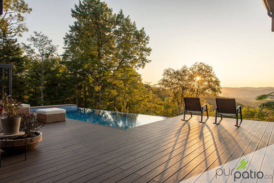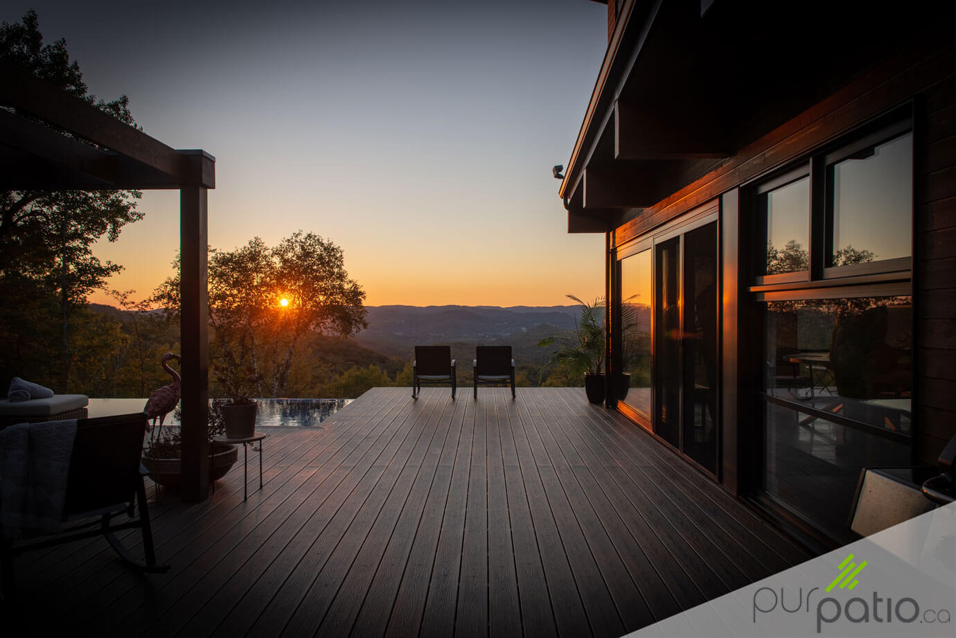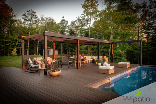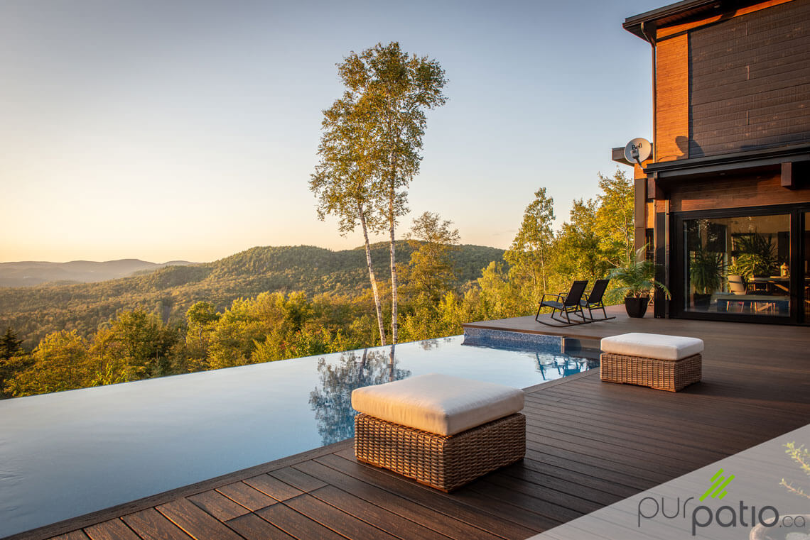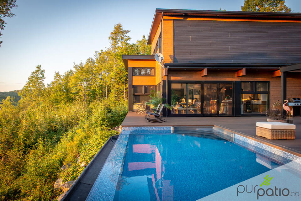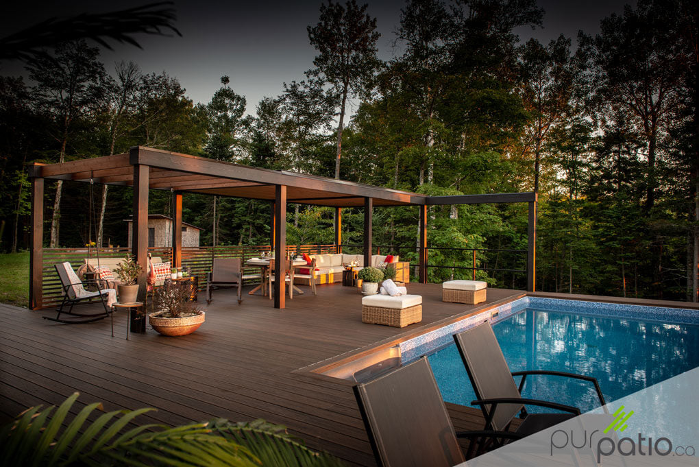 Cet immense patio en composite Trex que nous avons construit est tout simplement à couper le souffle. Étant donné sa grande superficie, le composite est parfait, car c'est un matériau sans entretien. Nous avons opté pour la couleur Spiced Rum qui s'agence bien avec les couleurs et le style moderne de la maison. La piscine à débordement est évidemment la vedette de cet aménagement. Notre objectif était donc de la mettre en valeur. Nous avons conçu une longue structure qui sécurise le patio tout en créant des aires de vie extérieures protégées.