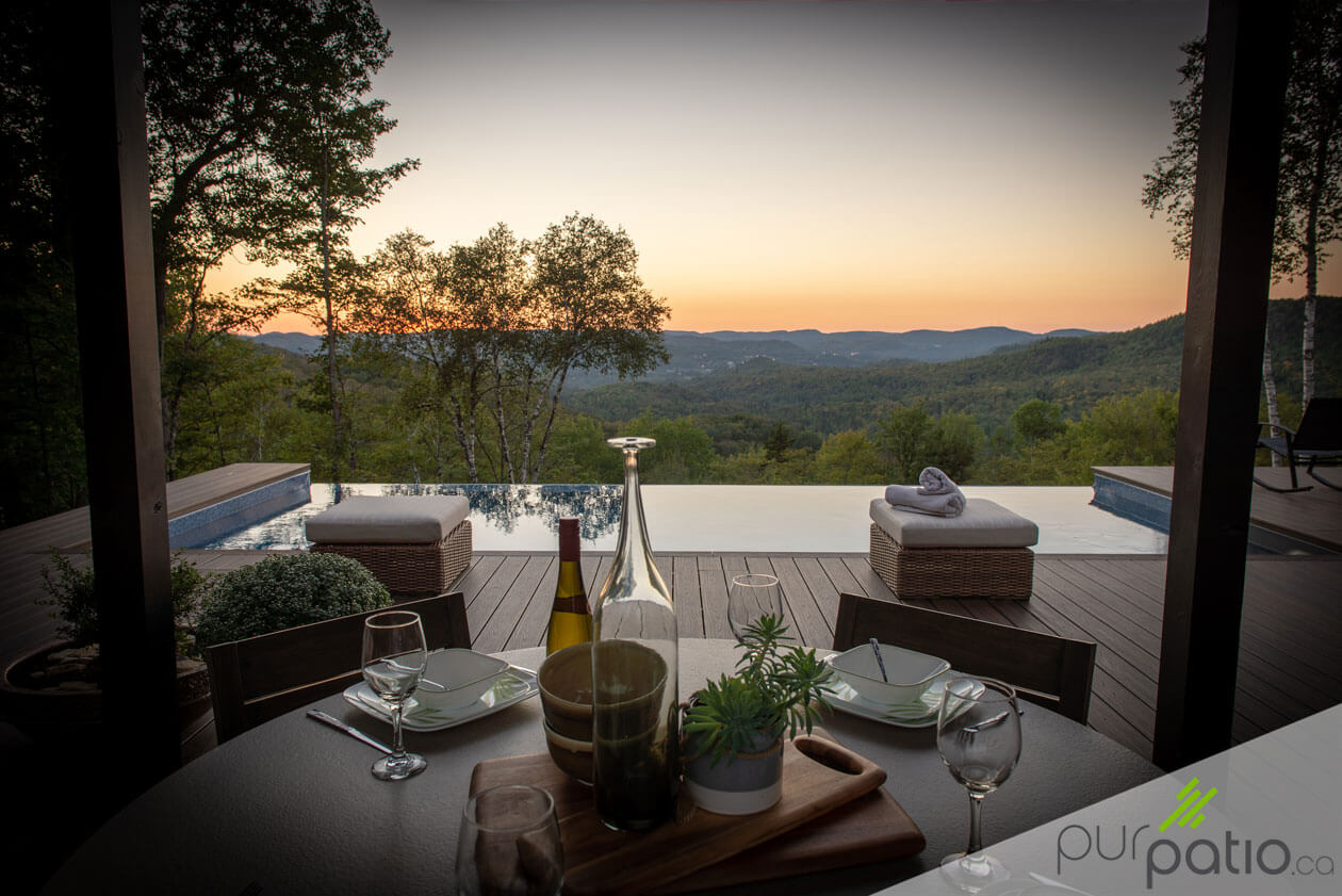 Tout d'abord, elle a une section pergola avec balançoire orientée vers les montagnes pour offrir un espace détente partiellement à l'abri du soleil. Ensuite, il y a deux sections couvertes par un gazebo, une salle à manger extérieure ainsi qu'un lounge. Ces zones sont à l'abri du soleil et de la pluie. Afin de profiter de la vue incroyable, tous ces espaces sont aménagés en fonction de celle-ci. C'est réellement un patio de rêve perché au sommet des montagnes des Laurentides.