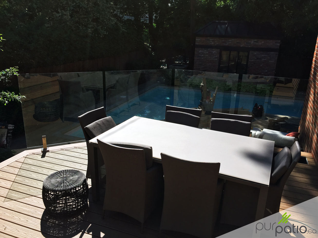 Notre mandat était de faire la rénovation de patio en bois pour un nouveau patio en composite. Les propriétaires souhaitaient avoir un patio qui allait durer longtemps et qui serait sans entretien. La fondation sur pieux vissés et la structure étaient en très bon état, alors nous avons conserver ces éléments. C'est pourquoi, la configuration du nouveau patio est restée la même que l'ancien. La couleur de composite choisie est Havana Gold de la gamme Transcend Tropical de Trex. Cette couleur offre un look semblable au véritable bois, mais sans ses inconvénients. Finalement, les rampes en verre du modèle Pure d'Aluminium Distinction ouvrent la vue sur la cour.