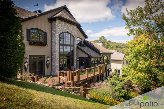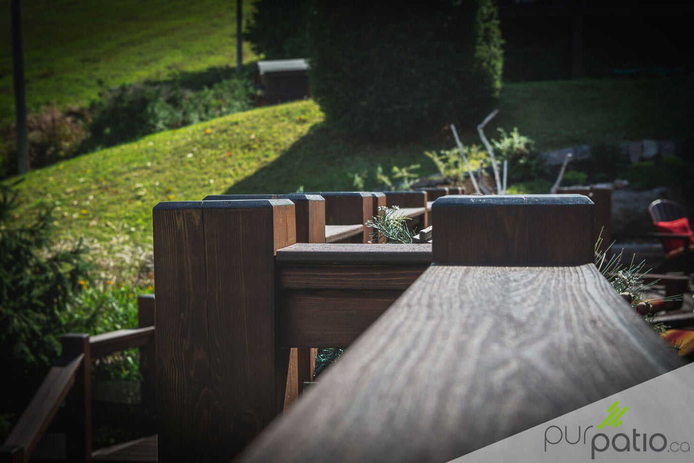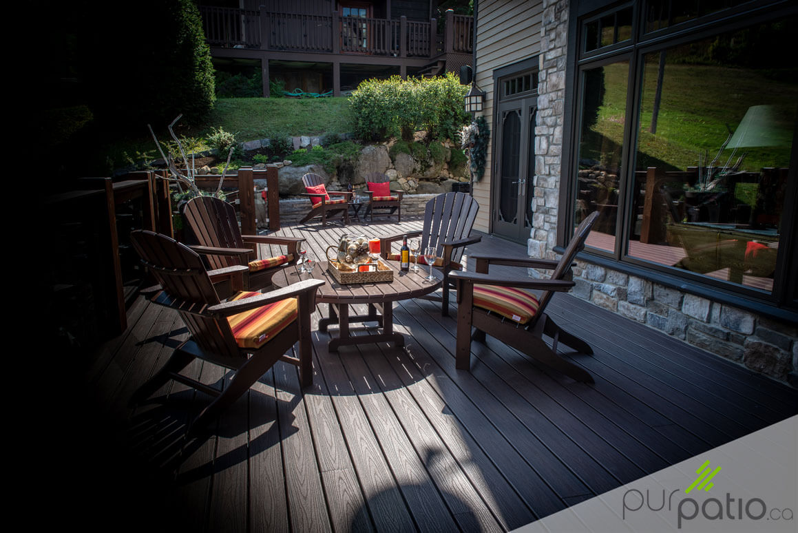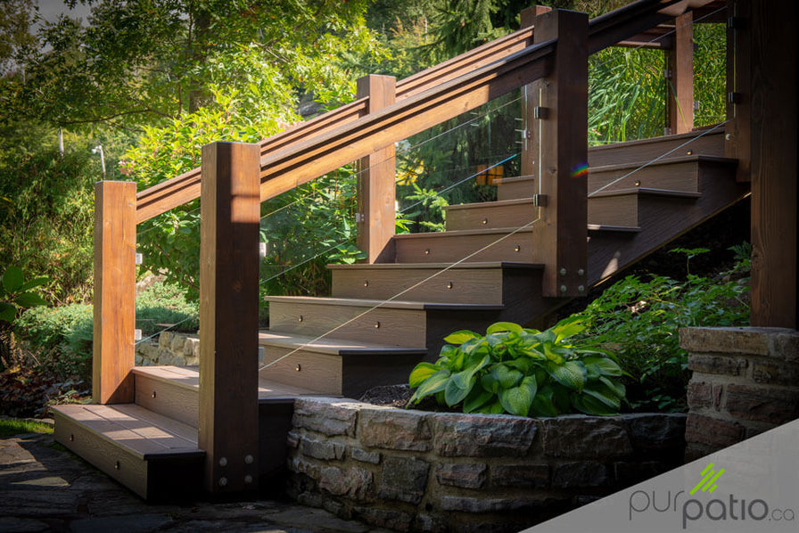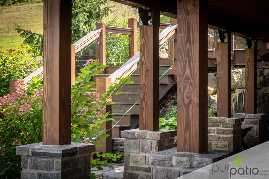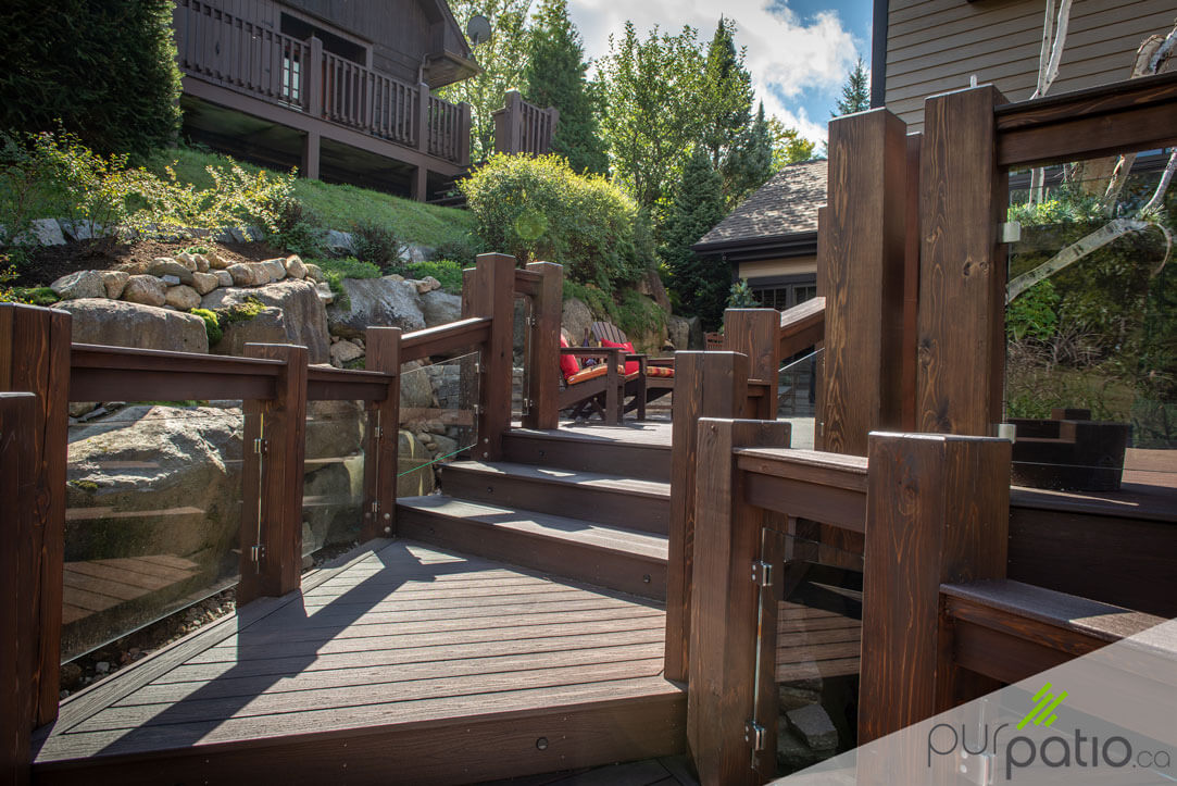 Les colonnes sous le patio ainsi que les garde-corps en cèdre rouge de l'Ouest sont faits sur mesure pour le projet. Nous avons soigneusement calculé et assemblé l'escalier en angle ainsi que les garde-corps qui la sécurisent afin de créer un look unique et avec du caractère. Finalement, des lumières agrémentent les contremarches pour créer une belle ambiance en soirée. Cette terrasse en composite est donc un endroit parfait pour profiter de la vue en journée et des soirées en bonne compagnie!