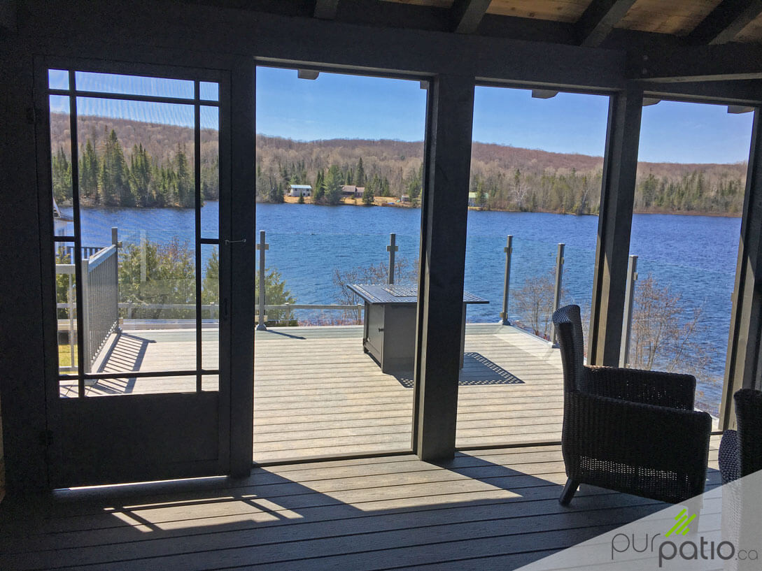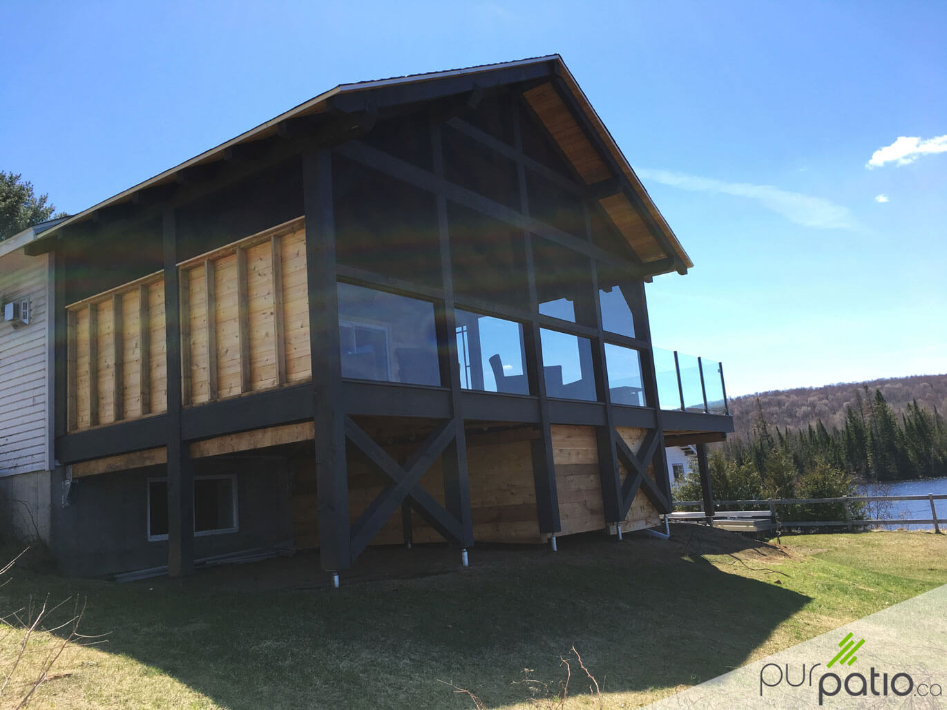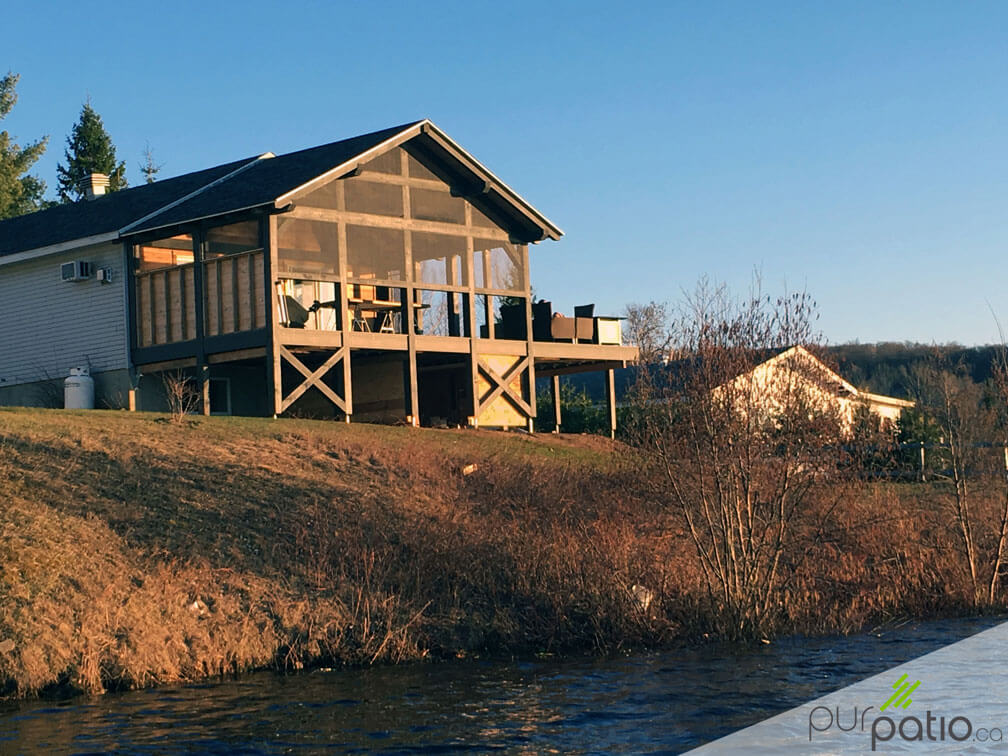 Cette imposante véranda en timberframe surplombe le lac et permet d’admirer les magnifiques couchers de soleil en toute quiétude. Nous l’avons construite à la suite d’un mandat de design personnalisé que nous avions réalisé pour ces clients. Ils souhaitaient avoir un prolongement de leur résidence vers le lac pour profiter de cette superbe vue, peu importe la température et à l’abri des moustiques. Nous devions aussi inclure un cabanon étanche en dessous et un patio non-couvert pour profiter du soleil.