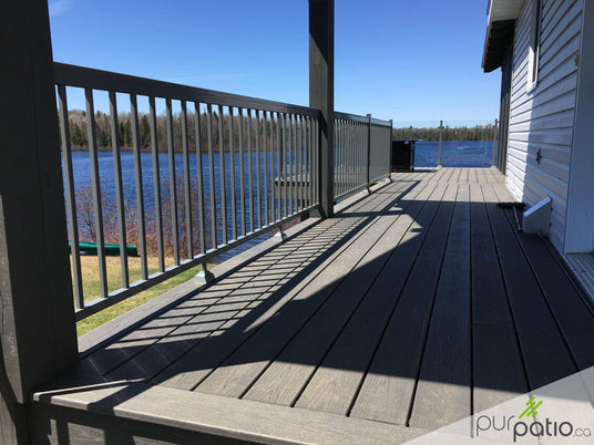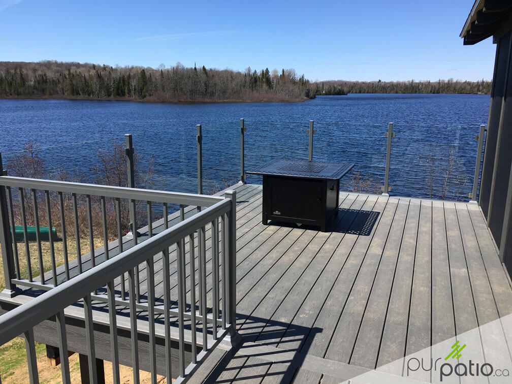 Le patio s’étend au-delà de la véranda pour créer une terrasse extérieure plein soleil. Des rampes grises Contemporaine d’Aluminium Distinction ceinturent les deux côtés face au lac. Les rampes du modèle Standard assurent la sécurité de tous les autres côtés. Dessous la véranda, le rangement est à l’abri de la pluie. Il est accessible par une grande porte coulissante permettant ainsi de ranger facilement les équipements sportifs et de plaisance une fois la saison estivale terminée.