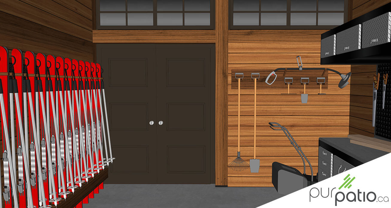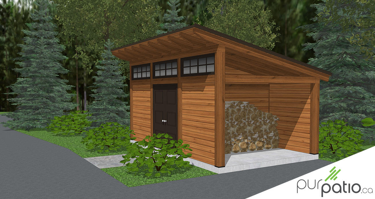 Afin d’ajouter une touche actuelle au design, nous avons choisi de le concevoir avec seulement une pente de toit. La toiture en aluminium brun ainsi que les portes et fenêtres de la même couleur correspondent à celles de la maison. La porte double est pratique puisque sa grande ouverture rend l’entreposage d’équipement beaucoup plus facile. Les fenêtres en hauteur, tant qu’à elles, permettent d’avoir une belle luminosité à l’intérieur. De plus, le rangement en deux parties est sur une dalle de béton et les colonnes sont fixées avec des ancrages spécifiques.