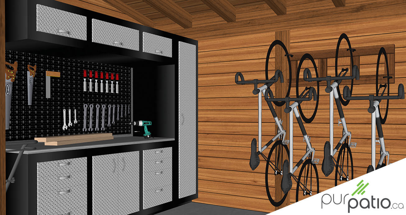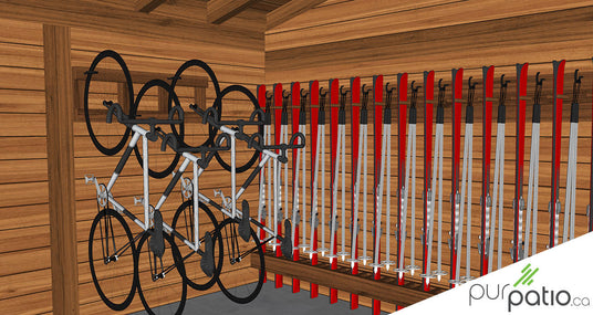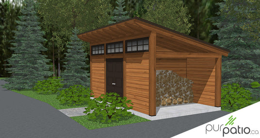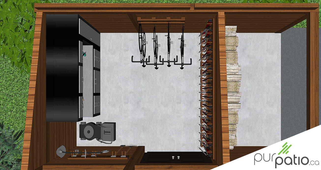 Tout d’abord, la partie fermée du cabanon est pensée en fonction d’y accueillir des vélos et de nombreuses paires de ski. L’aménagement permet également d’avoir un petit établi. C'est idéal pour ranger des outils et les accessoires pour l’entretien du terrain. Ensuite, la partie ouverte sur le côté est parfait pour empiler du bois et la profondeur permet de le protéger des intempéries afin que celui-ci reste sec. C’est une belle configuration qui sera très polyvalente au fil du temps.