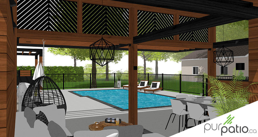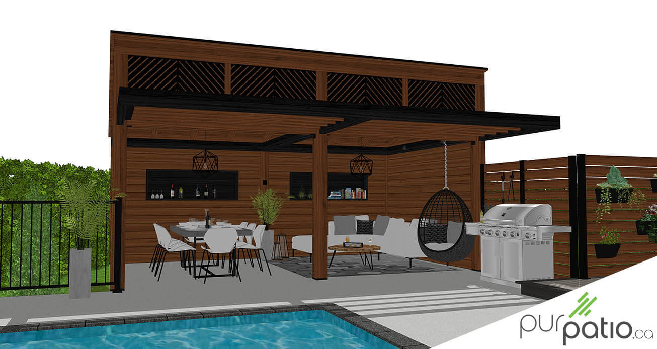 Une dalle en béton entoure l’espace près de la piscine. Sur celle-ci, on retrouve un grand gazebo en timberframe de pin blanc, teint Espresso et Noir Onyx de Sansin. Il offre donc une vue incroyable sur la piscine et sur le reste de la cour arrière. De plus, son toit à une pente, avec des découpes insérées dans les ouvertures à l’avant, lui donne un look unique et moderne. Il a également une pergola en longueur, juxtaposée à la poutre avant. Elle abrite ainsi le barbecue sans qu’il soit complètement en-dessous de la structure.