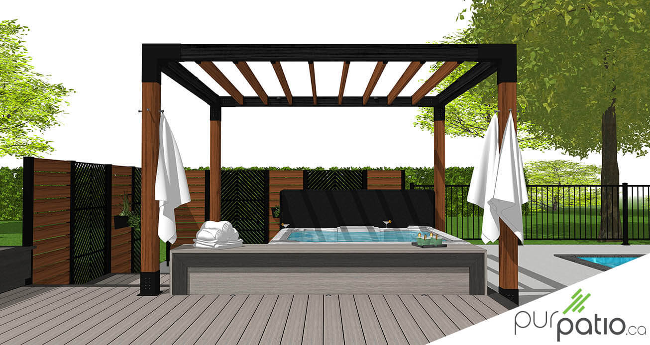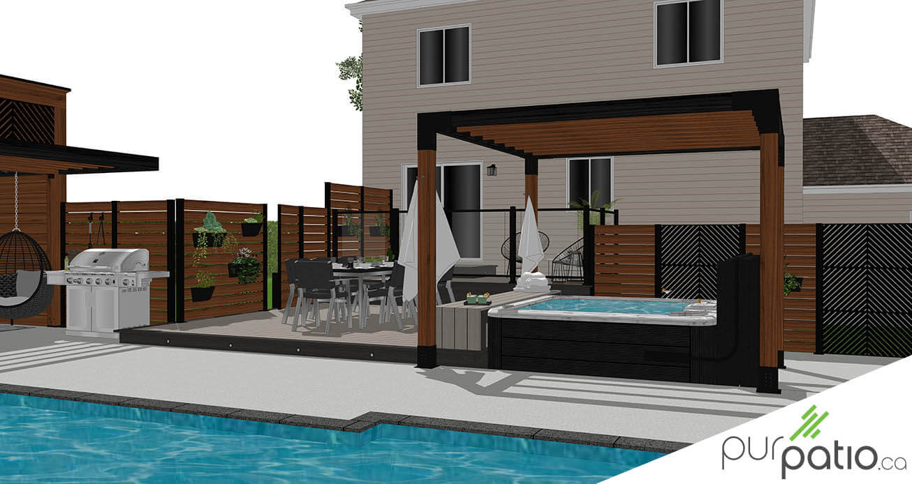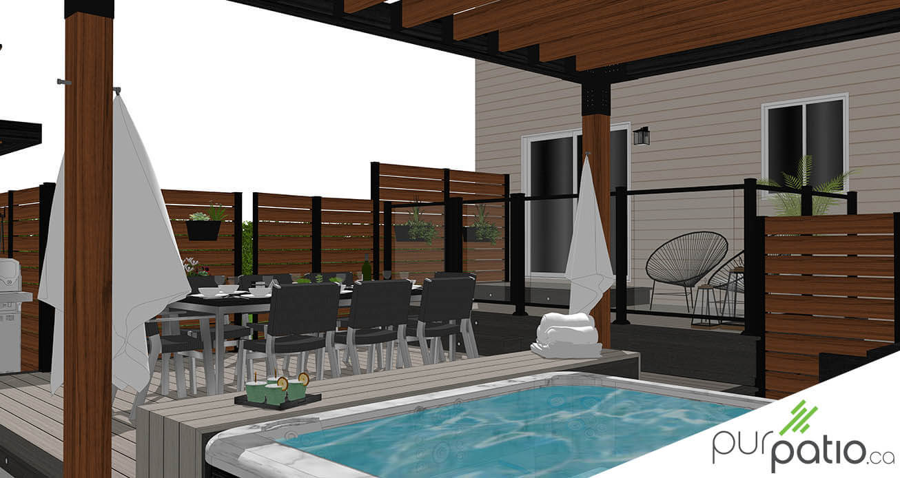 Ensuite, sur le palier principal, nous retrouvons une salle à manger. Aussi, une banquette en PVC est près du spa et on retrouve un accès à l’entrée de la cour par une porte. Celle-ci est dissimulée dans le mur d’intimité Hoft en aluminium et bois. De plus, une pergola en cèdre rouge de l’Ouest teint deux tons, soit Espresso et Noir Onyx de Sansin, couvre la zone spa. Un mur d’intimité Hoft, en aluminium et bois avec découpes intégrées, coupe la vue des voisins du côté et de l’avant. Une autre porte dissimulée dans ce mur permet un second accès à la cour.