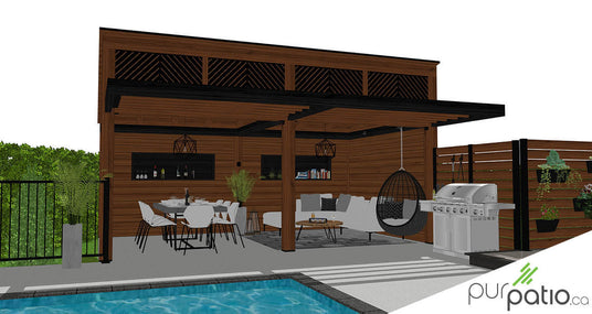Un patio élégant combinant pergola et gazebo, offrant un espace moderne et chaleureux pour se détendre, cuisiner et profiter de la piscine