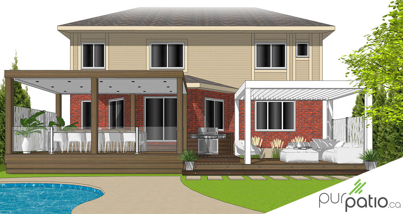 L’espace lounge est le dernier palier de la terrasse. Il est lui aussi de couleur Havana Gold. Il donne un accès pleine grandeur à la cour et il a un second accès près de la maison. Une pergola bioclimatique assure la protection contre le soleil et la pluie à ses occupants s’ils le souhaitent. Elle est blanche et a un look moderne et léger qui nous rappellent les aménagements de resorts de luxe du sud. Les paravents, qui sont identiques à ceux de la zone repas, créent l'intimité de cette section. Étant donné qu’ils sont disposés de chaque coté de cette longue terrasse, ils encadrent le tout et unifient l’ensemble. Des lumières Trex agrémentent toutes les marches pour créer de l’ambiance et étirer les réceptions jusque tard en soirée.