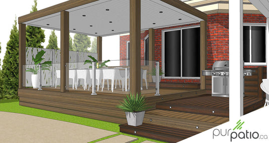 Un paravent fait de 3 panneaux d’aluminium blanc ajourés avec motifs abstraits assure l'intimité de la terrasse. Ensuite, des rampes en verre Contemporaines d’Aluminium Distinction sécurisent les autres cotés. Elles permettent de conserver la vue dégagée et de créer un effet de grandeur. Une rambarde en composite ferme le coté près de la maison afin de cacher la thermopompe qui se trouve derrière. Le palier suivant est conçu spécialement pour le barbecue. Il se trouve une marche plus basse, ce qui nous permet de dégager la vue de la fenêtre de la maison, tout en conservant un accès facile et proche à partir de la porte-patio. Le palier et la rambarde derrière le barbecue sont de couleur Spiced Rum de la gamme Transcend Tropical de Trex. Nous avons choisi cette couleur parce qu'elle contraste avec Havana Gold.