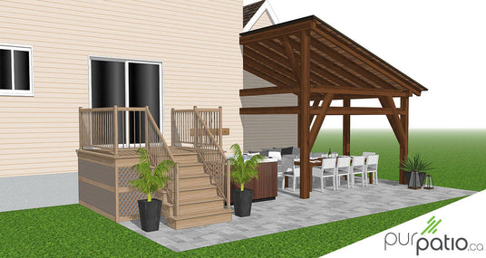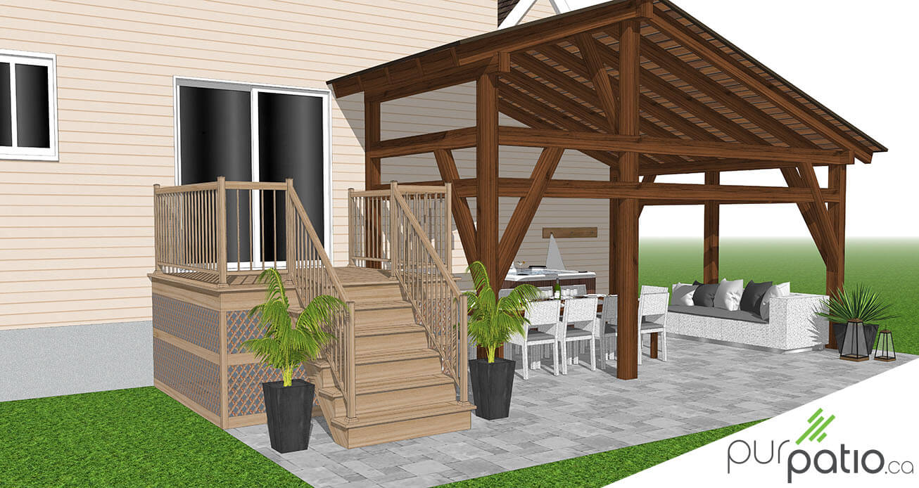 Ce client avait déjà un patio en bois et il souhaitait ajouter un gazebo en timberframe à son aménagement. Il n’était pas certain s’il préférait avoir un patio couvert ou une zone ombragée indépendante du patio. Notre mandat était donc de l’aider à faire son choix, c’est pourquoi nous lui avons soumis différentes versions d’aménagements possibles.