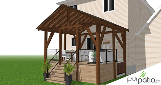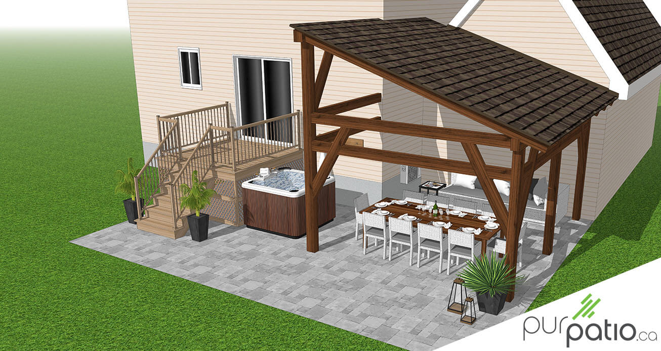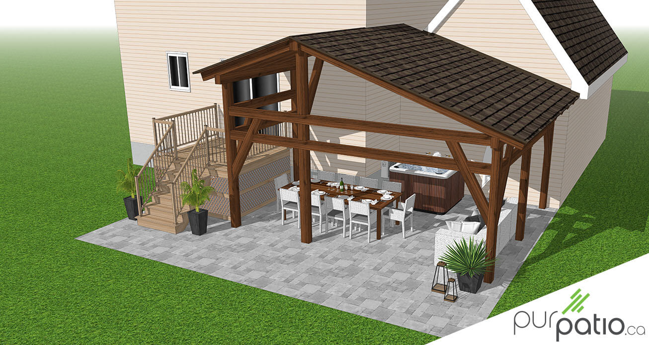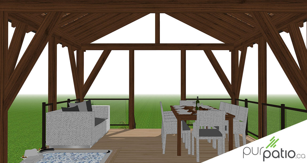 Le toit est en bardeaux d’asphalte, identique à celui de la maison afin de bien agencer la nouvelle structure avec celle-ci. Finalement, toutes ces propositions permettent au client d’intégrer plusieurs zones. Il y a une zone repas pour 8 à 10 personnes, une zone lounge et un spa. Selon l’option choisie, ils pourront donc profiter de l’été comme bon leur semble, au soleil ou à l’ombre sous leur gazebo en timberframe.