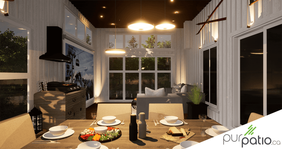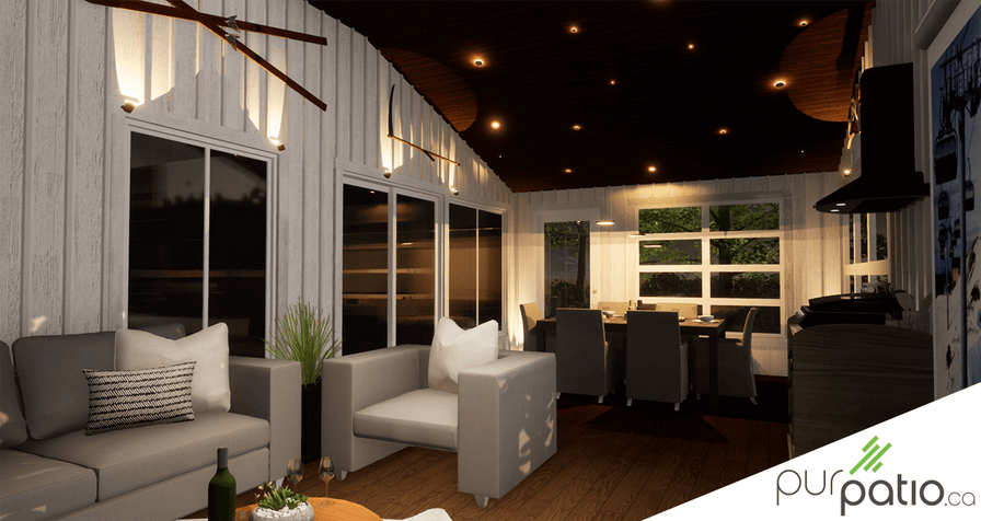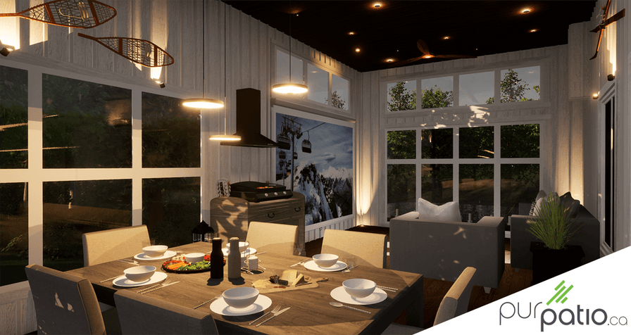 Ensuite, pour souligner les décorations spéciales présentes sur les murs de la véranda, nous avons opté pour des Mini Scope. Le flux lumineux de chaque appareil est orientable, donc nous en avons placé un de chaque côté des décorations. Cet éclairage les mets en valeur et leur procurent un look d’œuvre d’art. Aussi, il ne faut pas oublier les Flux encastrés dans chaque coin de la pièce. En éclairant vers le plafond, ils donnent une ambiance douce qui souligne les limites de l’espace. Finalement, pour rendre l’aménagement pratique, nous avons ajouté un appareil au-dessus de la salle à manger. Il s’agit d’un appareil Disc Pendant Trio. Chacun des Disc est fixé à une hauteur différente pour un plus bel effet lumineux. De plus, l’intensité des lumières est réglable selon l’humeur des convives à table. On peut donc dire que cette véranda ne manque pas de caractère avec son éclairage parfaitement unique!