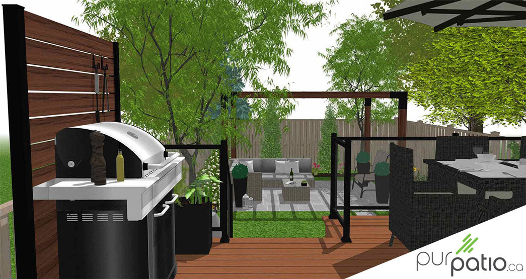 Le patio est composé en PVC Azek de la collection Vintage. Étant donné que les voisins sont très près de chaque côté de la cour, nous avons aménagé des murs d’intimité tout autour du patio. Un espace repas a été aménagé sur ce patio, sous un parasol. Nous retrouvons également une section barbecue, directement à la sortie de la porte patio. Cela simplifie donc les déplacements à l’intérieur lors de la préparation de repas. Dans les escaliers pour descendre à la cour, des lumières ont été incrustés dans les contre-marches. Les escaliers seront donc illuminés le soir pour être plus sécuritaires, en plus d’ajouter un look moderne.