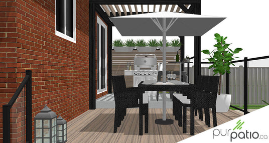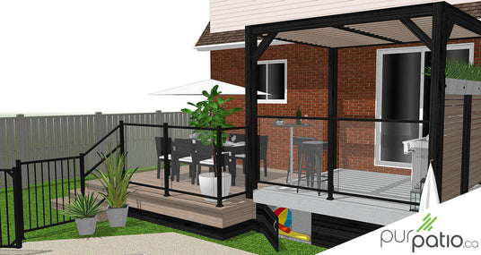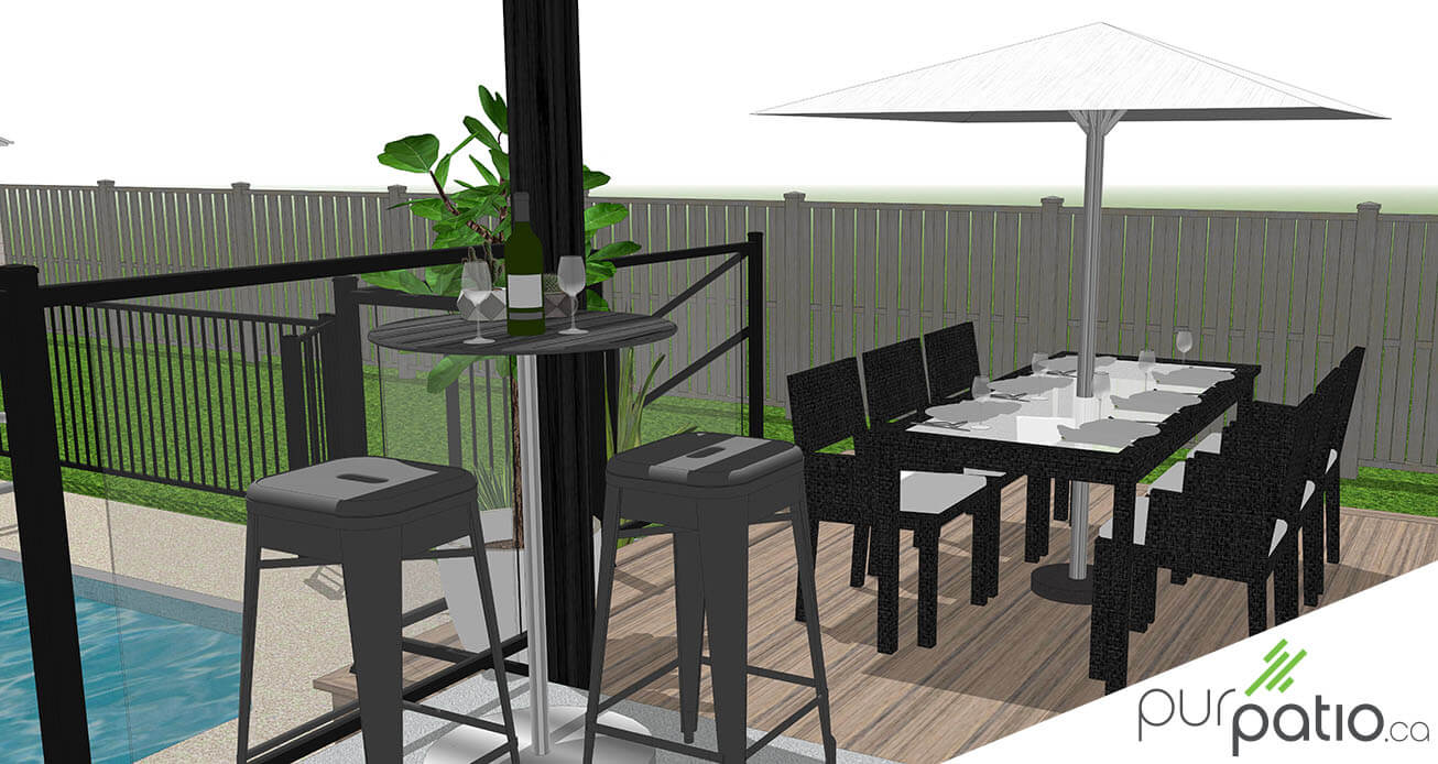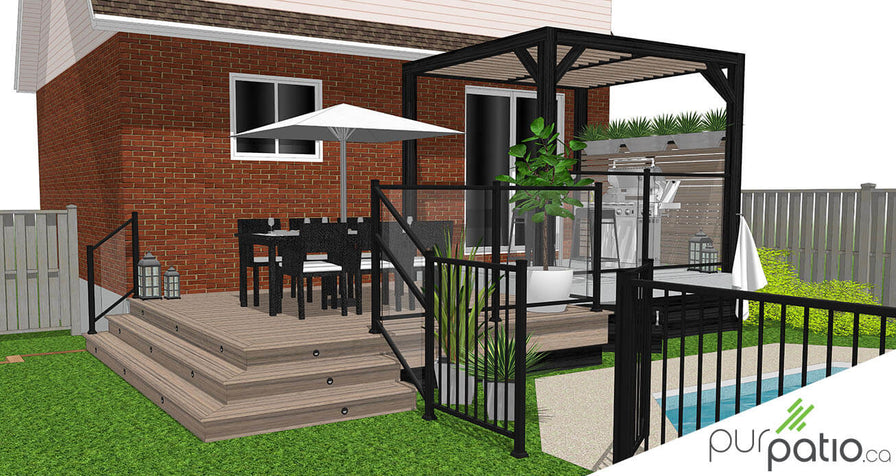 Notre mandat pour ce design était de conserver le patio en béton existant tout en unifiant l’aménagement complet de la cour. Nous avons donc opté pour un patio avec pergola qui est sans entretien pour relier le patio et la piscine. Il est en composite de la gamme Trex Enhance Natural couleur Rocky Harbor.