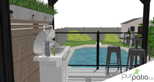 L’espace est parfait pour accueillir la zone repas conçue pour 6 à 8 personnes aisément. Des lumières agrémentent les contremarches et procurent une belle ambiance. Afin d’offrir une section ombragée aux occupants, nous avons aménagé un patio avec pergola sur la terrasse en béton déjà présente. Celle-ci délimite la zone barbecue tout en offrant de l’intimité par rapport aux voisins avec son paravent intégré en cèdre. L’endroit idéal pour s’installer avec un petit rafraichissement et surveiller les enfants dans la piscine!