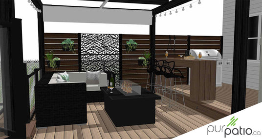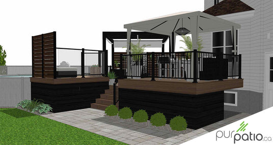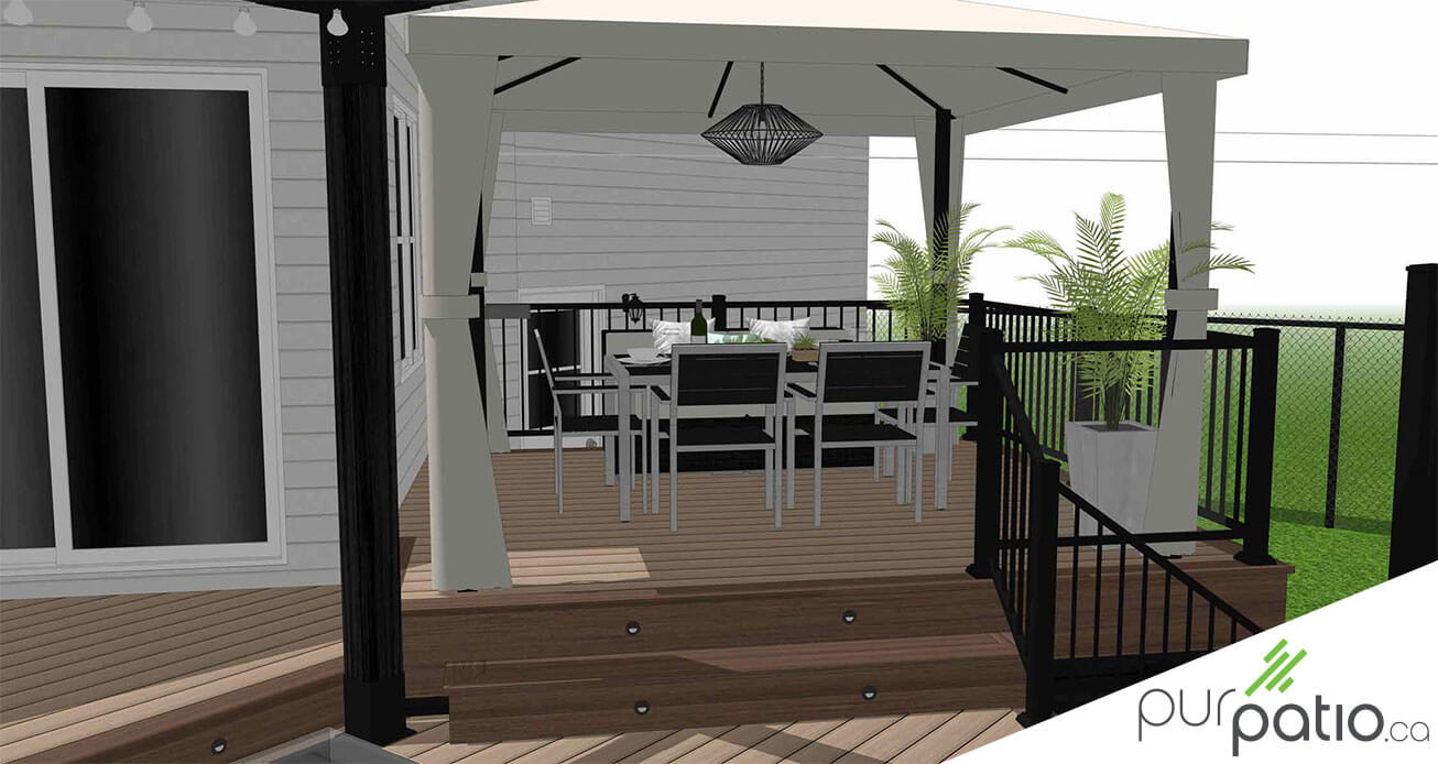 Ce patio conçu à St-Constant est composé de PVC Azek, un matériel qui ne nécessite aucun entretien. De plus, un autre avantage du PVC Azek est qu’il est moins chaud que le composite. Cela est donc plus confortable pour les pieds l’été. Sur le premier palier du patio, on retrouve la section bar, qui est également complétée par un barbecue.