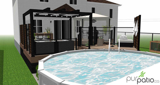 Finalement, la dernière section du patio est la section piscine. Cette zone est d’ailleurs protégée par une rampe en verre, ce qui est sécuritaire pour les enfants, et permet de garder un œil sur la piscine en tout temps. Ce projet de patio de piscine à St-Constant répond donc à tous les besoins du client!