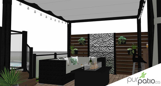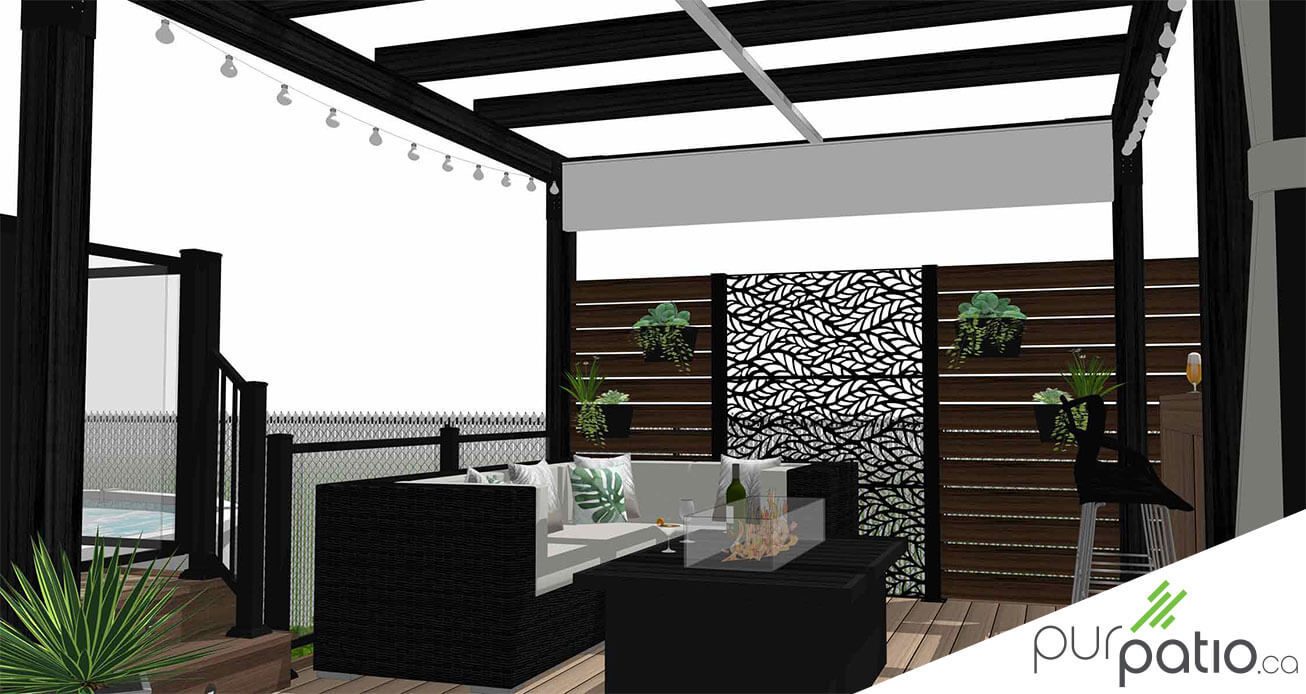À l’autre extrémité du patio se trouve la zone repas. Cette espace peut accueillir jusqu’à 6 personnes autour de la table. Elle est également à l’abri du soleil et de la pluie, puisqu’elle se trouve sous un grand gazebo. Un luminaire suspendu au plafond du gazebo permet d’ailleurs de profiter de la zone repas jusqu’à tard le soir. Sur le palier plus bas, une zone lounge a été aménagée. Cette zone est constituée d’un sofa en L ainsi que d’une table. C’est un endroit parfait pour prendre un verre le soir en plein air. Cet espace se trouve d’ailleurs sous une pergola en cèdre, qui est équipée d’une toile rétractable comme toit. Il est donc possible de profiter de la zone lounge beau temps, mauvais temps!