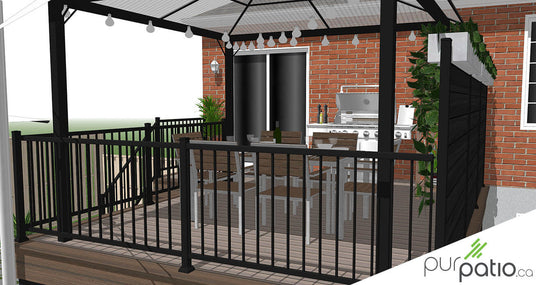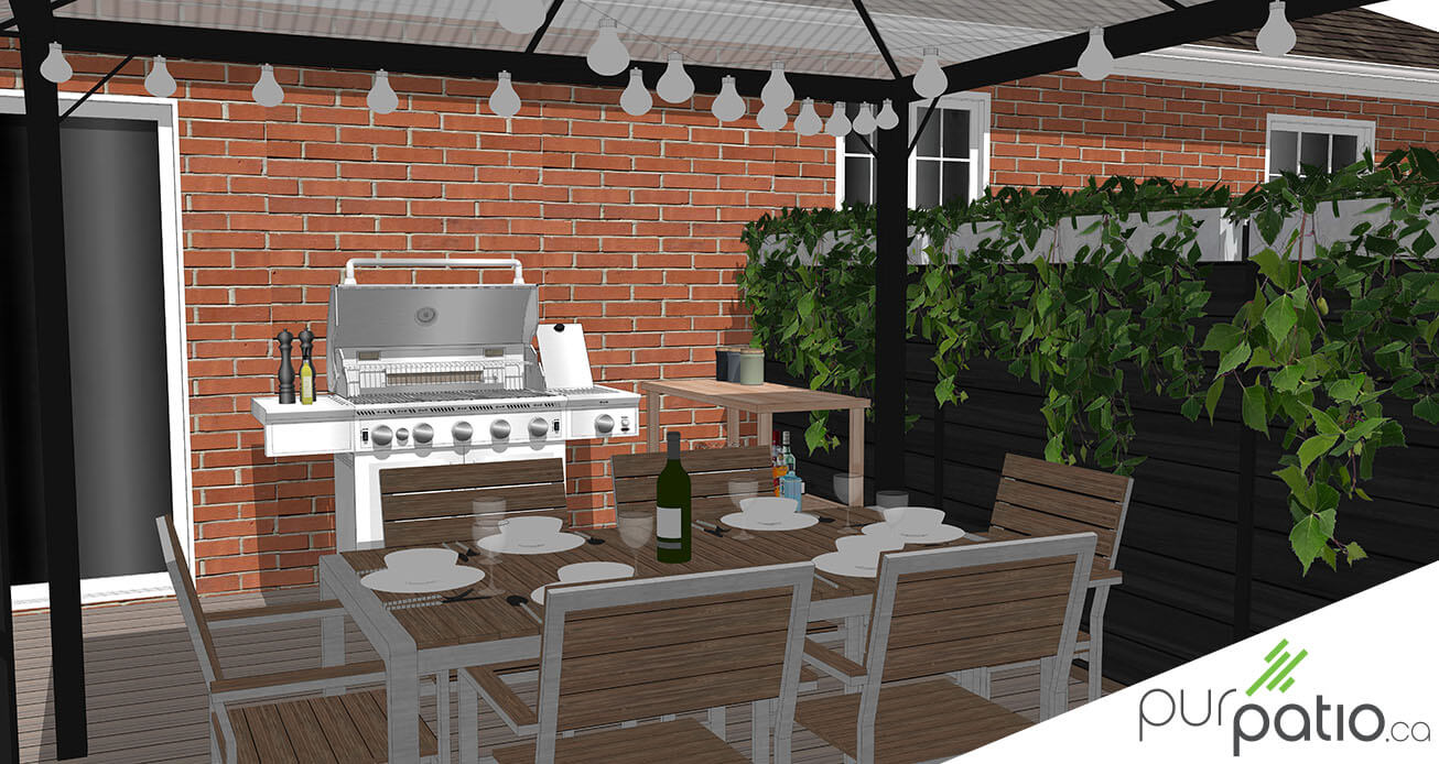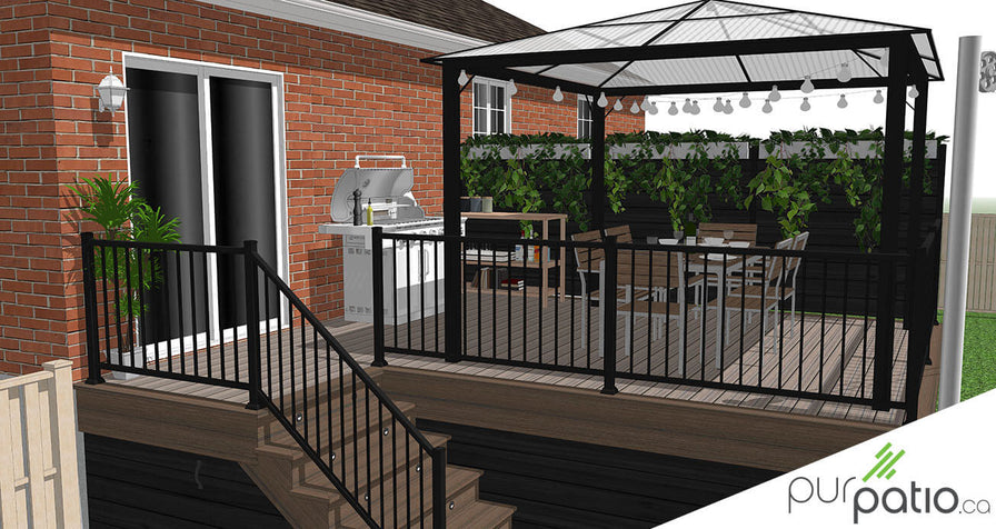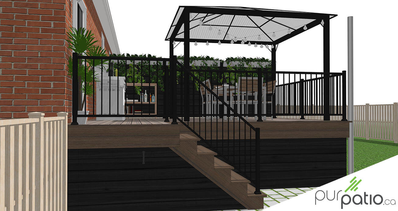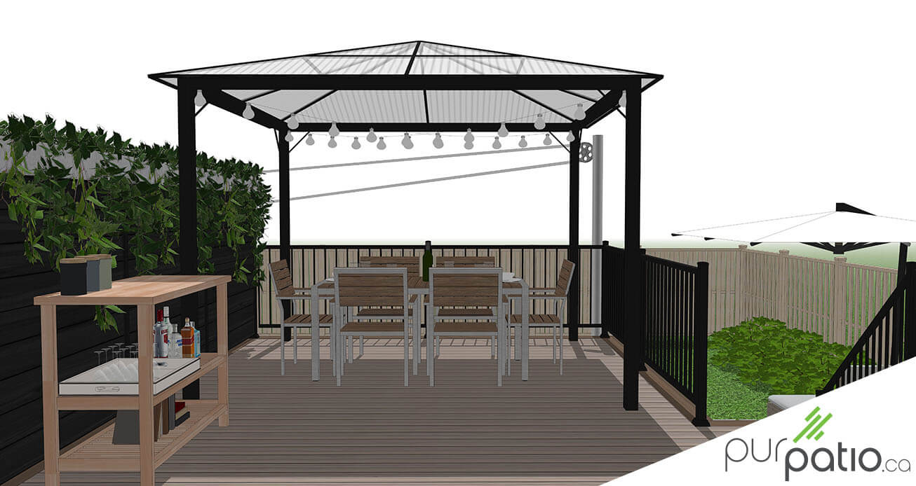 Notre design est donc pensé autour de ces deux zones. Sur le palier du patio, la superficie est suffisante pour y aménager une section salle à manger en plus du barbecue et d’un petit comptoir pour aider à la préparation des repas. C’est à cet endroit que nous avons choisi de mettre la gazebo. Nous avons pensé d’y suspendre des lumières d’ambiance pour les soirées en famille ou entre amis. Les contremarches sont également agrémentées de lumières.