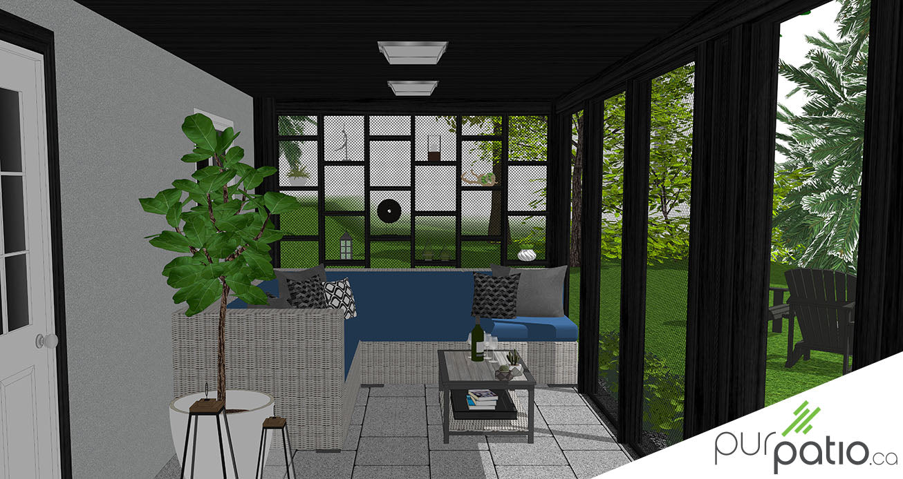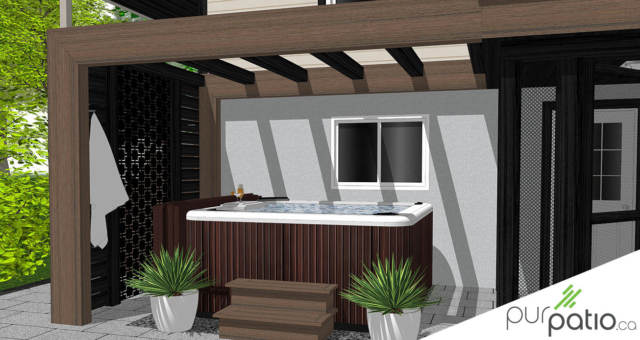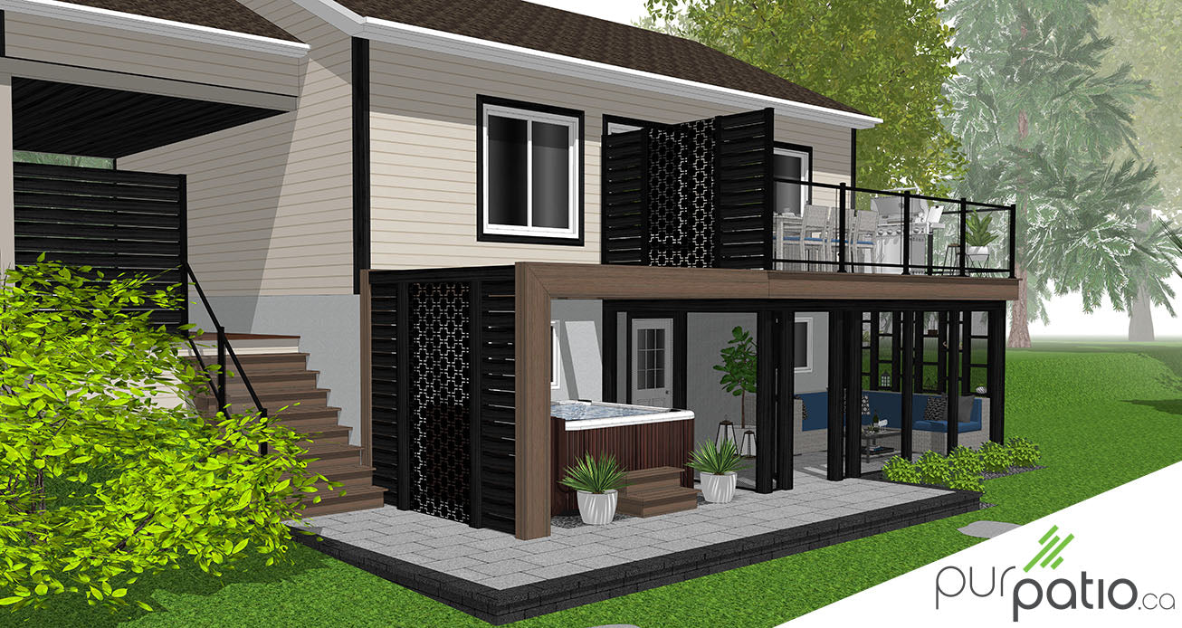 Ensuite, le spa se trouve sous une pergola hybride annexée directement à partir du plancher du patio. Elle est en composite et en cèdre rouge de l’Ouest. Nous avons choisi de faire une réplique du mur d’intimité du haut pour conserver la privauté de la zone en la fermant sur le côté. De plus, sous le patio, la véranda est construite sur une section pavée. Elle est en cèdre rouge de l’Ouest teint Noir Onyx de Sansin. Aussi, il y a des moustiquaires fixes qui ferment toutes les ouvertures. Ils sont montés dans des cadrages en bois teint.
