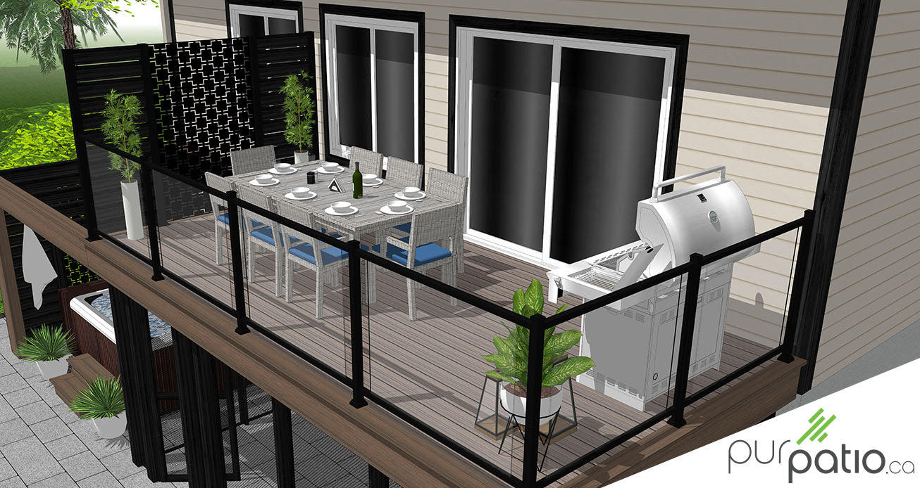 Pour commencer, nous avons d'abord dessiné un patio en composite Trex Enhance Natural au premier niveau. Il est de couleur Rocky Harbor et Coastal bluff. Nous avons placé un mur d’intimité en cèdre rouge de l’Ouest teint Noir Onyx de Sansin et monté sur des poteaux en aluminium protège de la vue des voisins. Des découpes en acier galvanisé aux motifs géométriques ajourés viennent dynamiser le style du mur. Des rampes noires modèle Murano d’Aluminium Distinction sécurisent les autres côtés du patio. Le mélange d’aluminium et verre dégage la vue vers le lac permettant ainsi d’admirer le panorama.