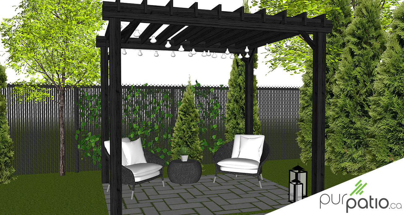 Pour compléter le tout, nous avons donné une deuxième vie à la pergola existante. Elle sert de section lounge dans la cours. Nous l'avons redressée et renforcie. Afin de l’agencer à la nouvelle terrasse, nous l’avons teint en Noir Onyx. Un amalgame parfait pour profiter d'un patio intime, même en plein cœur de la ville.