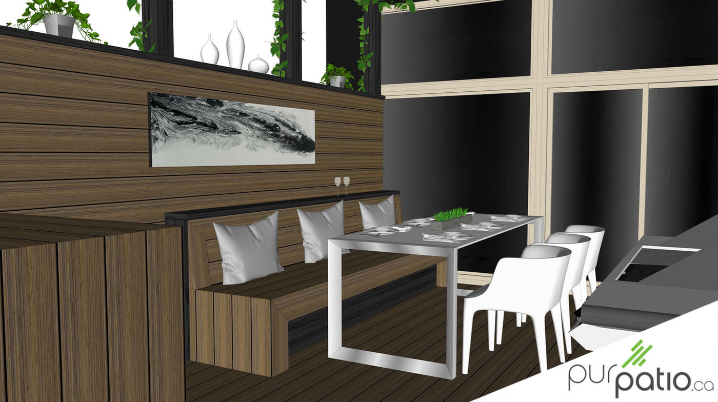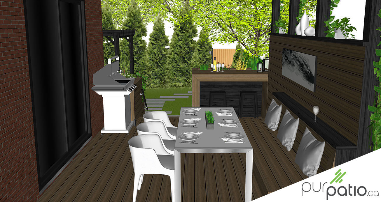 Nous avons construit un banc sur mesure qui nous permet d’optimiser l’espace. Ainsi, nous pouvions y installer un grand mobilier de salle à manger qui peut facilement recevoir 6 personnes, tout en conservant l’aire de circulation dégagée devant la porte-patio. Cette configuration nous a permis d'intégrer un bar ainsi qu’un comptoir avec boîtes à fleurs / fines herbes à même le patio. Ceux-ci font également office de garde-corps et de rangement au niveau du sol. La main courante y est fixée directement.
