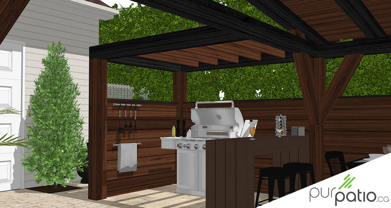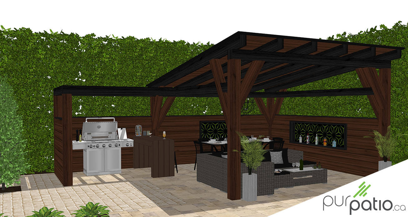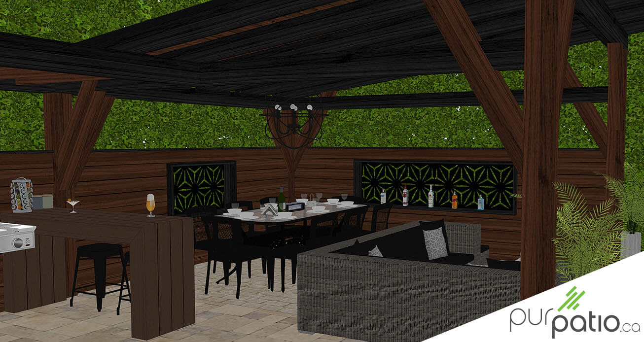 Ensuite, nous avons intégré des découpes en acier galvanisé noir aux murs. Ceci nous permettait d’avoir des alcôves, tout en créant un élément visuel intéressant. Les murs ont également pour effet de créer une atmosphère enveloppante et chaleureuse. Toute la structure du gazebo et de la pergola, en plus des murs d’intimité, sont d'une alternance de couleurs Espresso et Noir Onyx de Sansin pour s’agencer avec le patio.