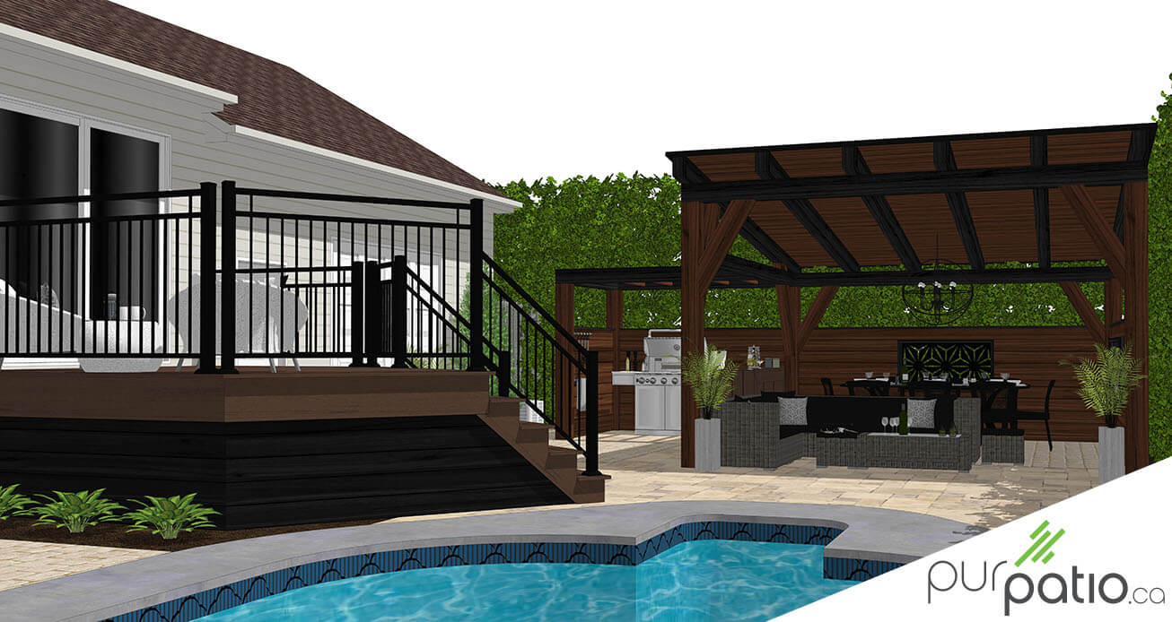 Le mandat de design que nous devions réaliser pour ces clients avait pour but de reconfigurer leur patio. Ils souhaitaient qu'il soit plus ergonomique et mieux adaptée à leur cour. Nous devions également concevoir un gazebo en timberframe pour remplacer le gazebo existant, acheté dans un magasin grande surface. Nous avons donc opté pour un patio TimberTech et pour un gazebo en pin afin de répondre à tous leurs besoins.