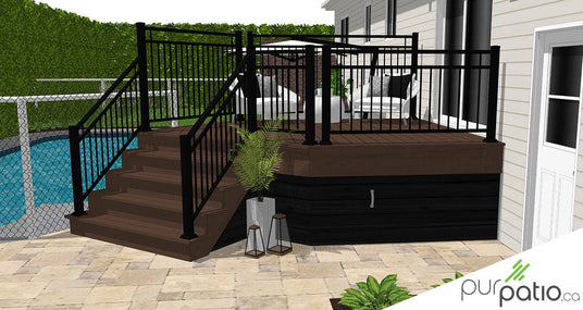 En premier lieu, le patio TimberTech, collection Terrain de couleur Brown Oak est d’une forme asymétrique. Cette forme a pour but de maximiser l’espace disponible entre la maison et la piscine. Nous avons orienté les marches vers la section pavée où est situé le gazebo. Des rampes noires modèle Patrimoine d’Aluminium Distinction ceinturent le périmètre. Sous le patio, une jupe en cèdre rouge de l’Ouest teint Noir Onyx de Sansin cache un rangement, accessible par une porte.
