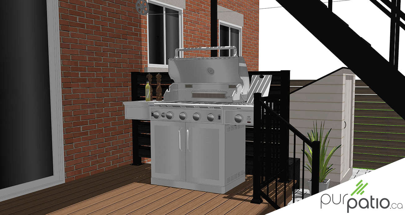 Nous avons donc positionné un premier palier sous le patio existant qui servira à l’espace barbecue. Puisqu’il est à proximité de la cuisine et qu’il sera couvert, c’est l’endroit idéal pour cuisiner beau temps, mauvais temps. Des petits murs d’intimité délimitent l’espace, en plus de cacher la thermopompe. De plus, on peut y accrocher des bacs de plantation pour faire pousser des épices.