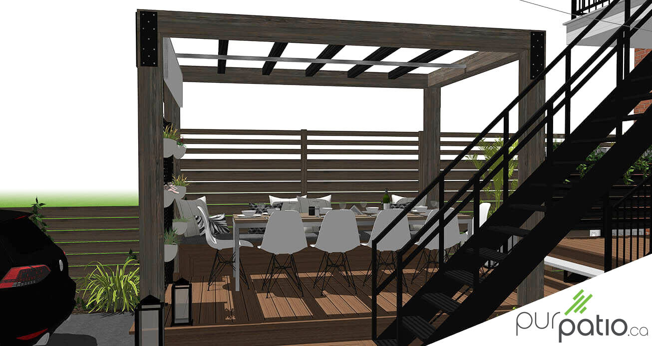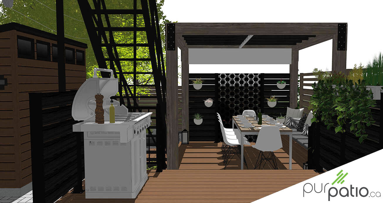 Ensuite, le palier principal accueille la zone repas sous une grande pergola en pruche. Le timberframe est assemblé avec des fers à angles dans les coins, permettant ainsi d’avoir une bonne solidité et de donner un look à la structure. Un mur d’intimité en cèdre rouge de l’Ouest teint Noir Onyx de Sansin est ajouté au fond pour cacher la vue des voisins arrière. Des découpes en acier galvanisé noir aux motifs géométriques sont placés au milieu, créant ainsi un beau focus visuel.