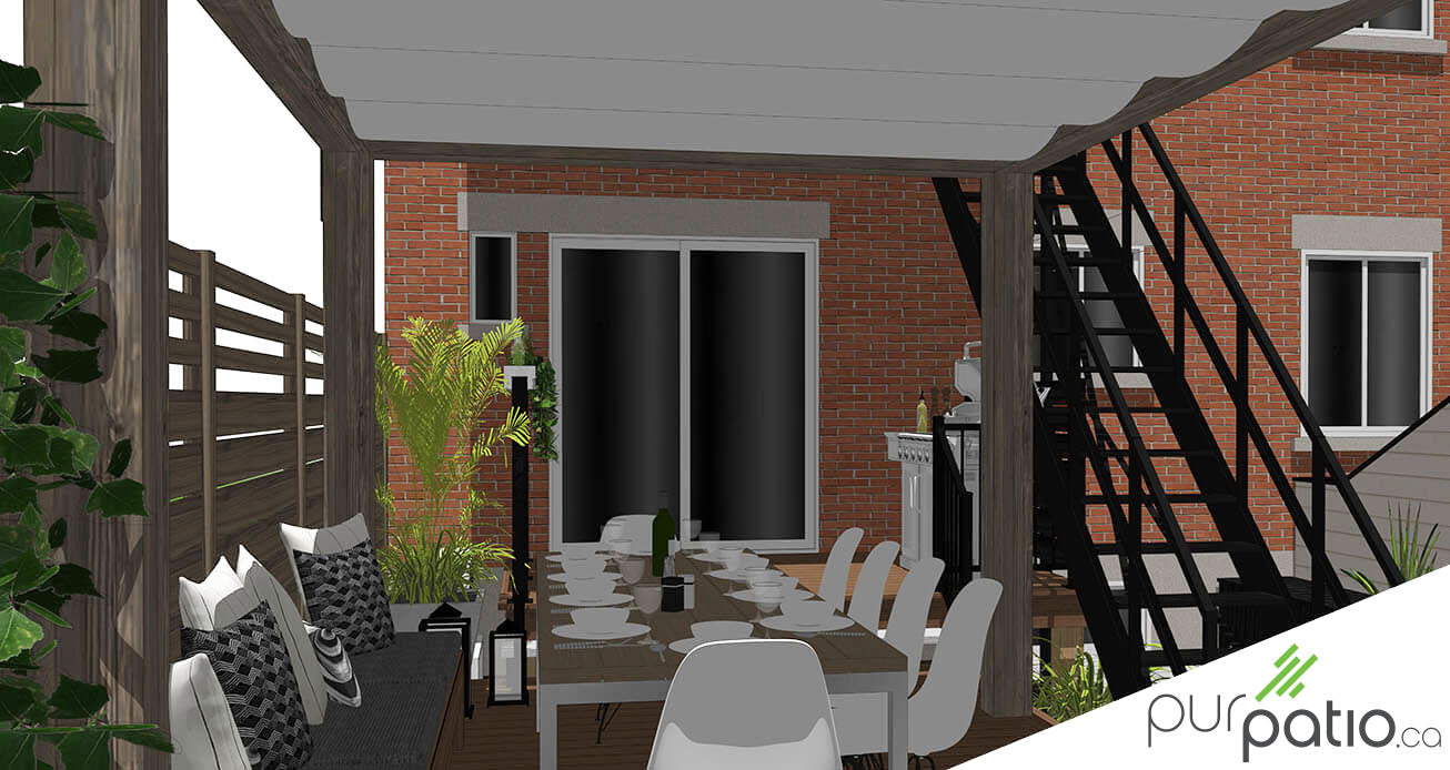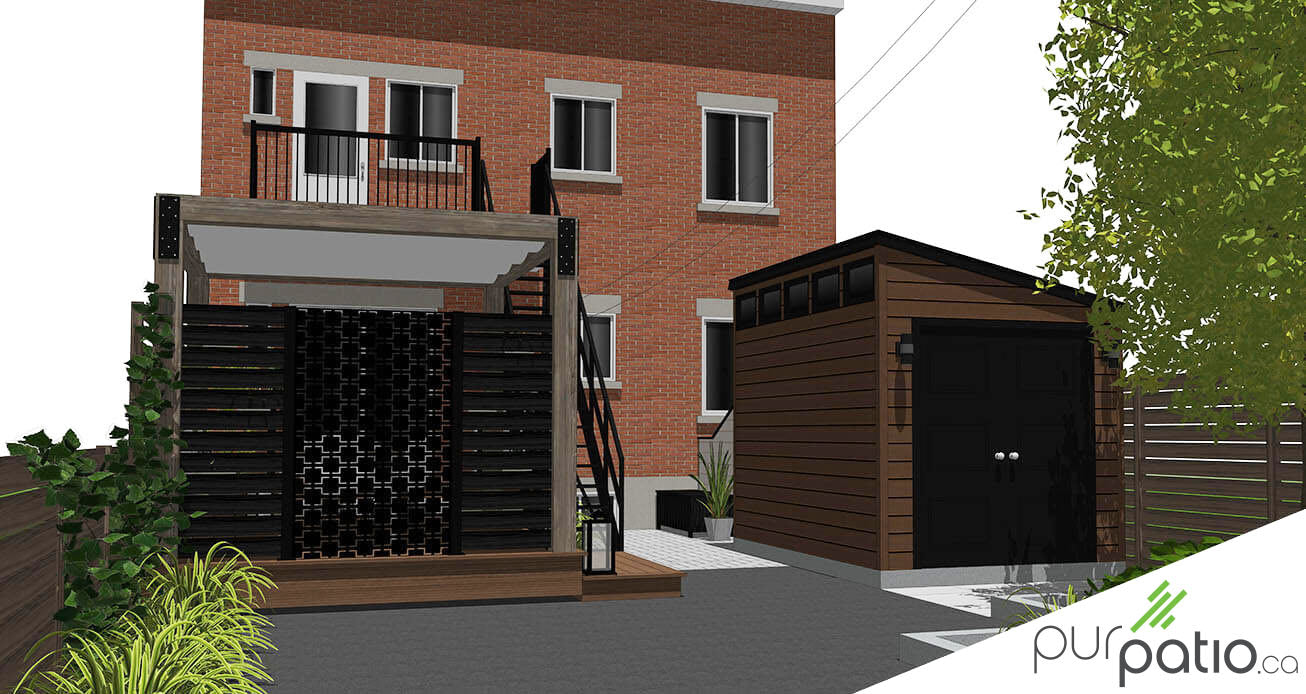 Par ailleurs, nous avons intégré une voile d’ombrage rétractable qui permettra de protéger les occupants du soleil. Elle pourra aussi préserver l’intimité par rapport aux voisins en hauteur. La grande banquette en composite optimise l’espace sur la terrasse, ce qui permet d’avoir une zone repas intime pour 10 à 12 personnes aisément. De plus, les clôtures en bois déjà présentes, assure l’intimité latérale de l’aménagement. Finalement, nous avons proposé un cabanon au look moderne qui s’agence au reste du design de la cour pour remplacer celui existant.