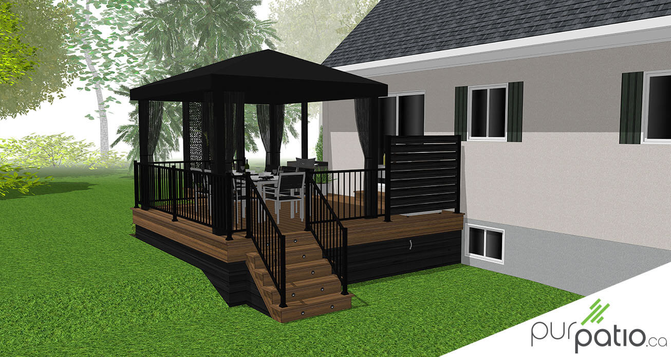 Le mandat de design personnalisé réalisé pour cette cliente avait pour but de lui créer un patio sans entretien. Elle voulait également avoir une section repas et une section lounge, toutes deux ombragées. Elle possédait déjà un grand gazebo qu’elle souhaitait conserver. C’est pour toutes ces raisons que nous avons opté pour un patio Trex.