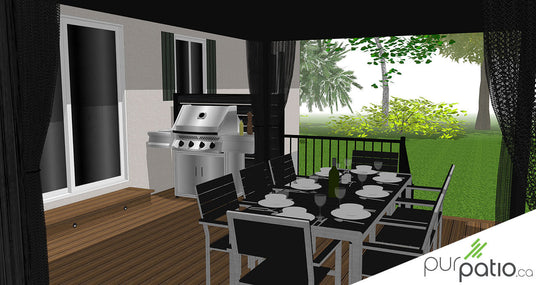 La couleur Havana Gold de la gamme Transcend Tropical ressemble à du véritable bois, mais sans les inconvénients. La configuration à deux zones nous a permis de placer le barbecue et la salle à manger près de la porte-patio, donc près de la cuisine afin de faciliter la préparation et le service des repas. En plus, le gazebo de cliente était parfait pour couvrir la section repas. Un muret en cèdre délimite l’espace barbecue. Il est teint de couleur Noir Onyx de Sansin. Des rampes à barreaux d’Aluminium Distinction sécurisent le reste du périmètre.