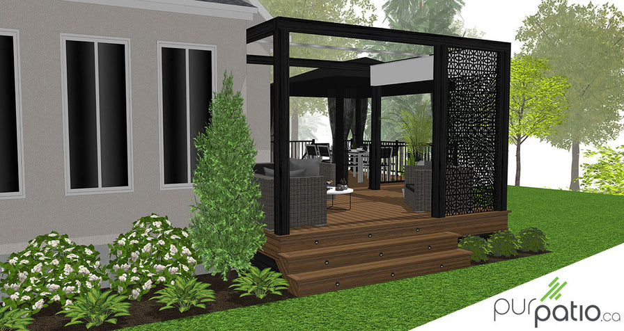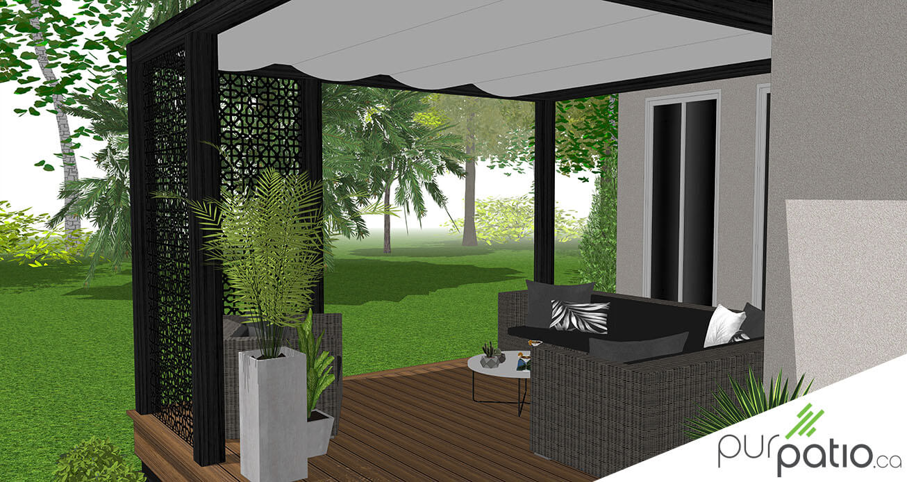 Dans la seconde zone, une pergola en cèdre enveloppe l’espace. Elle est également Noir Onyx de Sansin. Nous y avons intégré un coin en découpes d’acier galvanisé noir, modèle l’Espagnol afin de créer un focus visuel. Elle est aussi équipée d’une voile d’ombrage rétractable afin d’offrir une section complètement à l’abri du soleil aux occupants. Tous ces éléments teints en Noir avec la couleur bois du composite donne un look moderne au design.