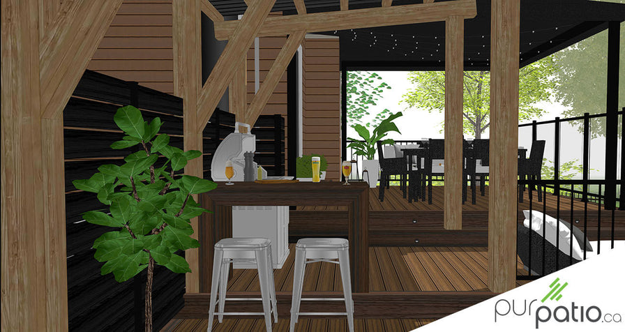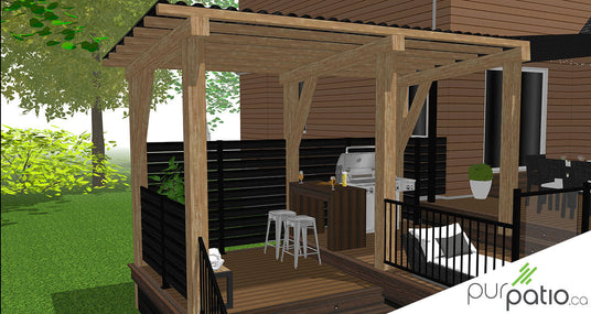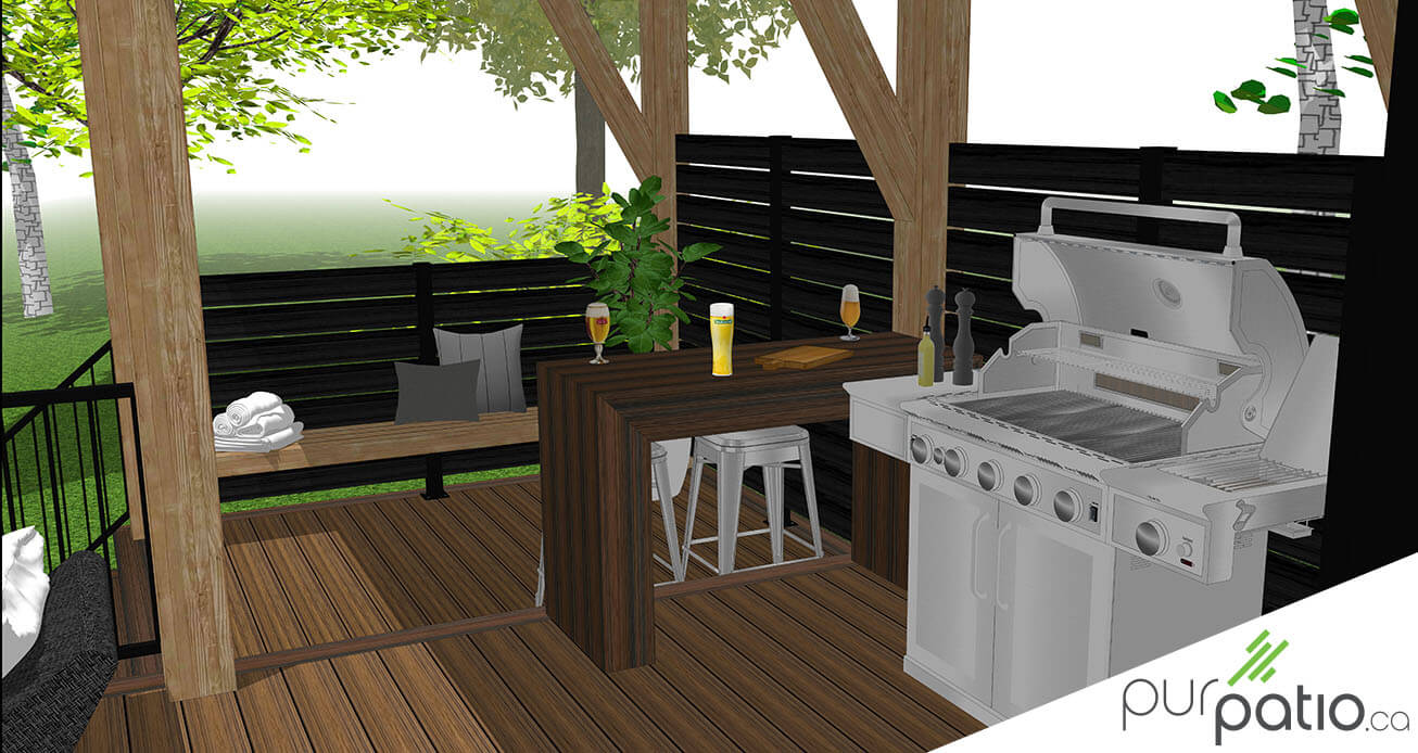 Le barbecue se trouve sous un gazebo en pruche, qui recouvre 2 paliers, soit celui-ci et l’autre plus bas. Il est pensé en fonction de créer un espace de transition entre la maison et la piscine. Les gens peuvent y déposer leurs serviettes et autres effets. De plus, un comptoir bar en composite se situe entre les deux paliers. Il vise à rendre les 5 à 7 agréables en attendant le repas. Nous avons choisi de faire le patio Trex Tropical de couleurs Havana Gold et Spiced Rum. C’est un matériau durable et sans entretien.
