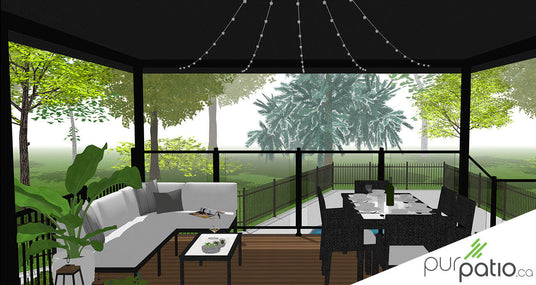 Ensuite, la jupe sous le patio nous a permis de dissimuler un rangement, accessible par des portes doubles. Elle est en cèdre rouge de l’Ouest teint Noir Onyx de Sansin. Des murs d’intimité, également en cèdre de la même couleur, sont sur le côté avant du patio. Pour le côté arrière, des rampes sécurisent l'espace tout en dégageant la vue. Elles sont en aluminium noir et en verre et il s’agit du modèle Murano, d’Aluminium Distinction. Finalement, des lumières agrémentent les contremarches pour une belle ambiance en soirée.