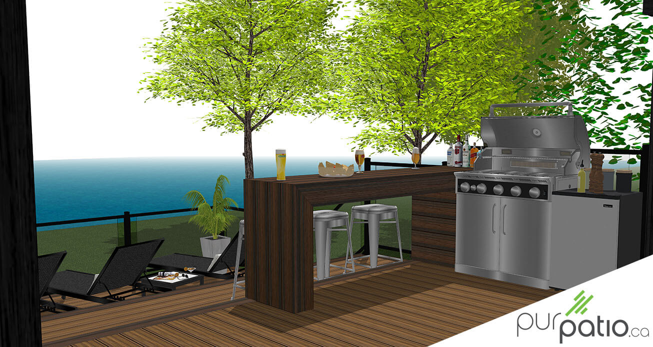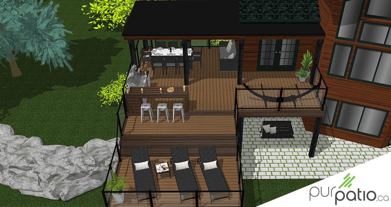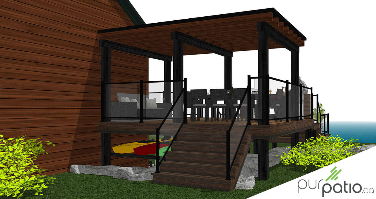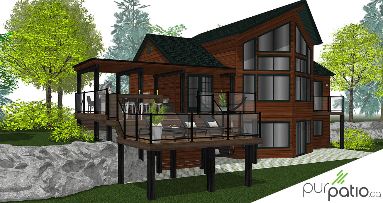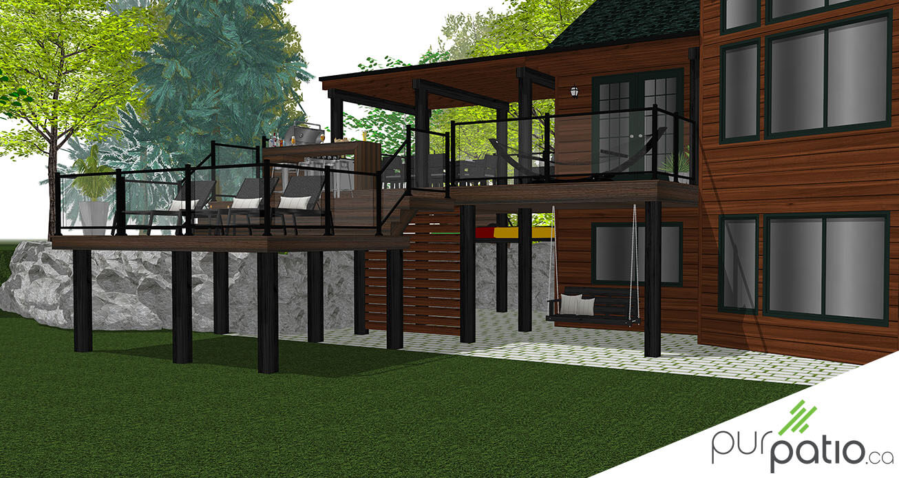 Le chalet de ce client offre une superbe vue sur le lac qu’il souhaitait mettre en valeur avec un design de patio Trex à plusieurs niveaux. Ce nouveau patio devait inclure une section repas, une section lounge, une section barbecue avec bar ainsi qu’un espace détente pour admirer le paysage. Le dessous devait accueillir une balançoire suspendue orientée vers le lac et un espace de rangement pour les kayaks. Avoir une portion protégée du soleil était aussi un critère important.
