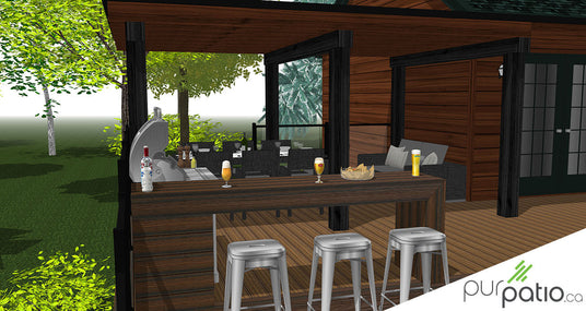 Nous avons donc dessiné un patio en composite Trex Transcend Tropical. Nous avons choisi deux couleurs, Havana Gold et Spiced Rum. Ces tons chauds se marient parfaitement au bois du chalet en plus d’être un matériau sans entretien. Nous avons conçu un gazebo en pin à toit plat sur mesure. Il protège les occupants à la sortie de la porte-patio jusqu’à la section repas et lounge. La zone barbecue avec bar en composite est installée juste à côté afin de faciliter la préparation et le service des repas.