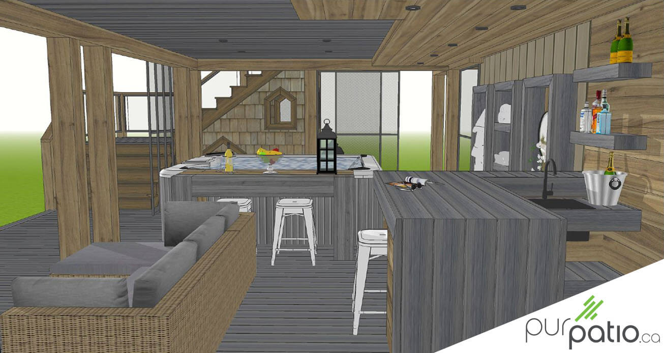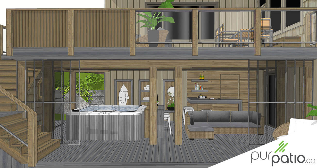 Une véranda avec des moustiquaires et des vitres coulissantes composent le premier niveau. Elle protège donc ses occupants du soleil, de la pluie et des moustiques. Nous avons réalisé un espace conçu pour le divertissement où l'on retrouve, entre autres, le spa. Il comporte aussi deux bars et un divan sectionnel, orienté vers la cours. Nous avons agencé la structure apparente de timberframe en cèdre rouge de l’Ouest au composite. Nous avons opté pour la couleur Island Mist de la gamme Transcend Tropical de Trex. Cette couleur donne le ton au décor qui se veut rustique avec une touche de modernité et d’audace.