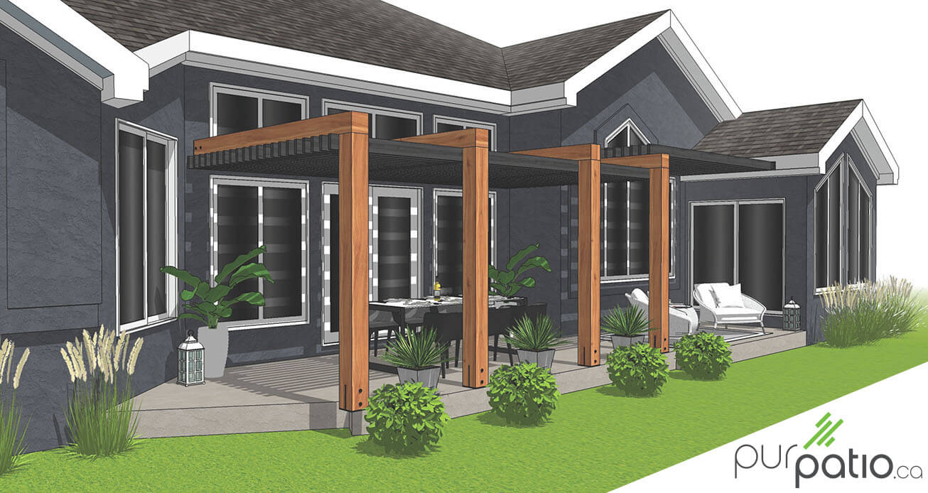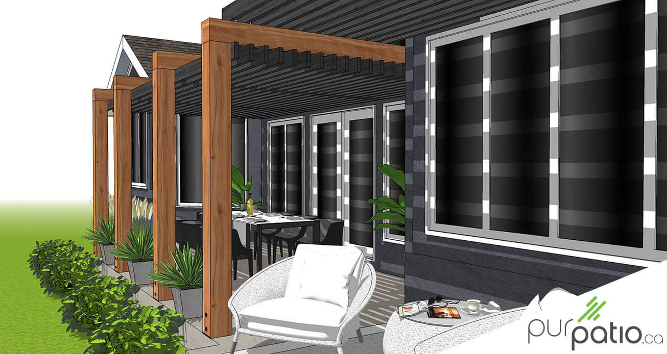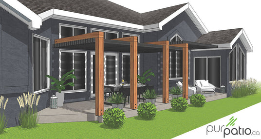 Nous avons fait la structure en timberframe avec des colonnes et des poutres 8’’x8’’ en cèdre rouge de l’Ouest. Nous l'avons fixée à la dalle de béton ainsi que directement sur le revêtement de la maison à l’aide de fixations métalliques (knifeplate) que nous avons pensées sur mesure pour le projet. Les traverses en cèdre teint offrent une protection partielle du soleil. Ça permet ainsi de ne pas limiter l’entrée de lumière par les nombreuses fenêtres de la maison. Elle couvre cependant suffisamment l’espace extérieur pour ne pas y être pleinement exposé. C'est ainsi être beaucoup plus confortable d'être en plein cœur du calme de la nature.