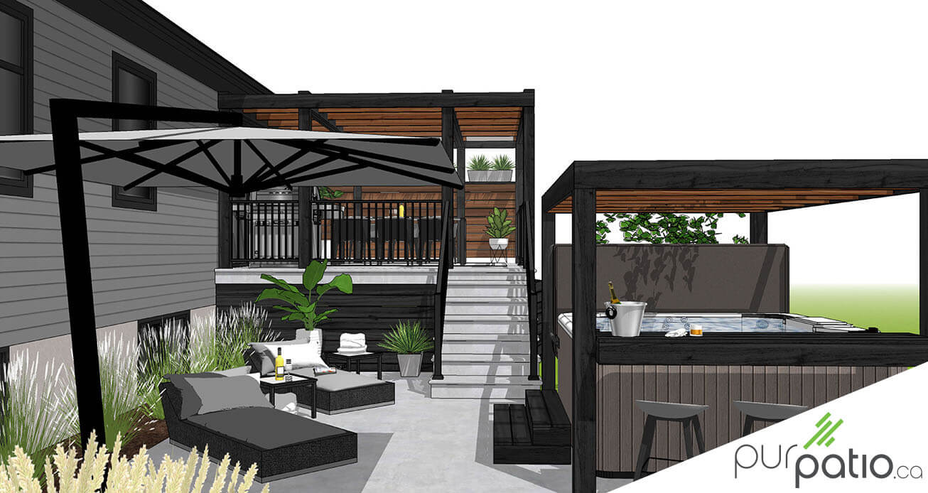 Ce client avait un patio en béton sur deux niveaux qu’il venait de faire construire. Il souhaitait donc qu'on aménage le tout de façon complète. Notre mandat était d'intégrer des éléments pouvant lui permettre de profiter de l’extérieur en toute intimité et à l’abri du soleil s’il le souhaitait.