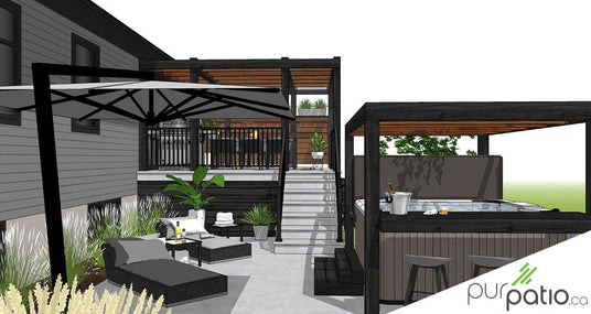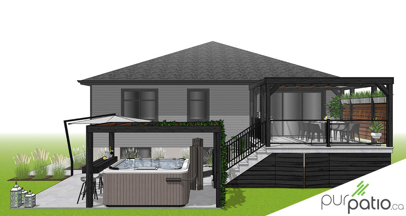Au niveau du sol, nous avons aménagé un espace pour le spa. Il a une pergola similaire à celle de la zone repas afin d’assurer la continuité de l’aménagement. Celle-ci n’a pas de voile. Cependant, nous prévoyons que les végétaux grimperont à la structure pour procurer de l’intimité et de la protection à ses occupants. Elle comprend un bar en bois d’un côté. Il permet aux gens de boire un verre dans le spa en compagnie de ceux qui ne veulent pas se tremper! De plus, l’espace est suffisamment grand pour y intégrer une section détente. Nous l'avons donc agrémenté de deux chaises longues à proximité du spa.
