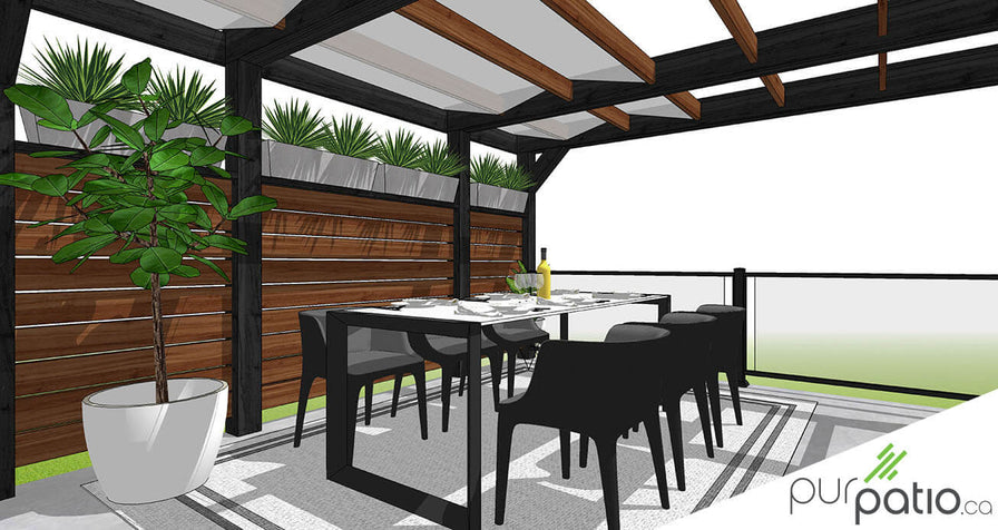 Nous avons alors consacré le palier au niveau de la porte-patio à la section repas. C'est pourquoi nous y avons positionné le barbecue ainsi qu’une table. Cette section peut accueillir confortablement de 6 à 8 convives. Nous avons conçu une pergola en cèdre rouge de l’Ouest. Nous l'avons teint Noir Onyx et Espresso de Sansin. Elle couvre l’entièreté du niveau. Elle a un mur d’intimité en bois horizontal du côté des voisins latéraux. Des bacs de plantation agrémentent le mur pour créer une ambiance chaleureuse et naturelle.